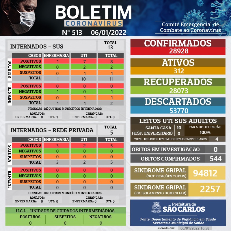 São Carlos confirma 483 resultados positivos de Covid-19 neste dia 06-01-2022