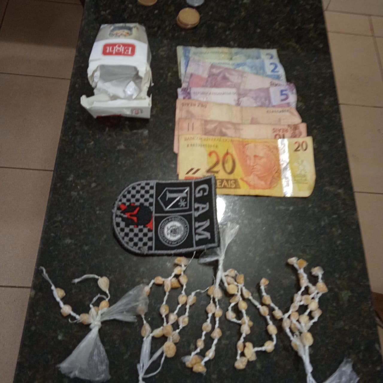 Segundo informações, a GM foi para o local para averiguar um suspeito de tráfico de drogas. Quando a equipe da GAM se aproximou do indivÃduo este se levantou foi bater no portão de uma casa. Foi efetuado a abordagem e com o suspeito foi encontrado a quantia de R$ 56,25, (cinquenta e seis reais e vinte e cinco centavos) e próximo a ele, em uma lixeira foram localizadas 76 pedras  de crack, dentro de uma caixa de cigarros, e R$  27,95 (vinte e sete reais e noventa e cinco centavos). A ocorrência foi apresentada na Central de PolÃcia Judiciária, onde a droga foi apreendida e o averiguado liberado.