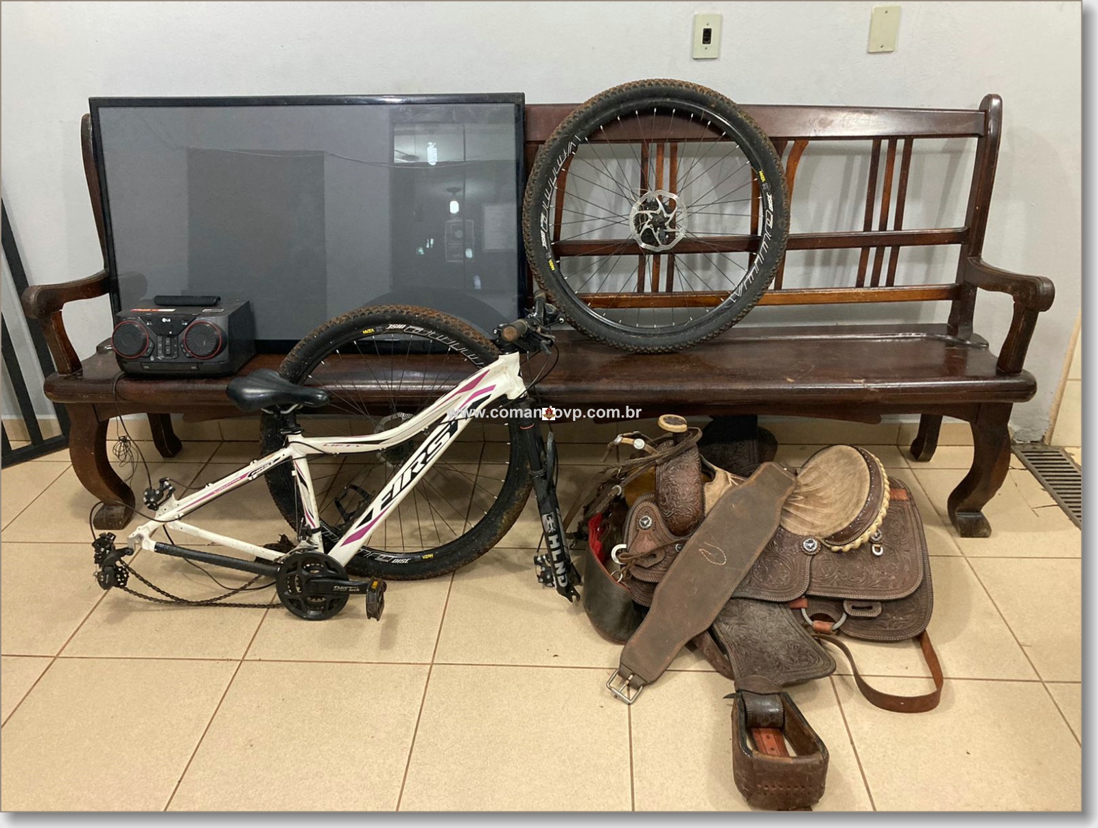 No veÃculo foram localizados uma tv, uma sela, um aparelho de som e uma bicicleta. Os detidos acabaram confessando que haviam acabado de pratica o delito. Todos foram encaminhados à Central de PolÃcia Judiciária, onde os maiores foram autuados em flagrante por furto e recolhidos ao Centro de Triagem de São Carlos. O  menor foi liberado.