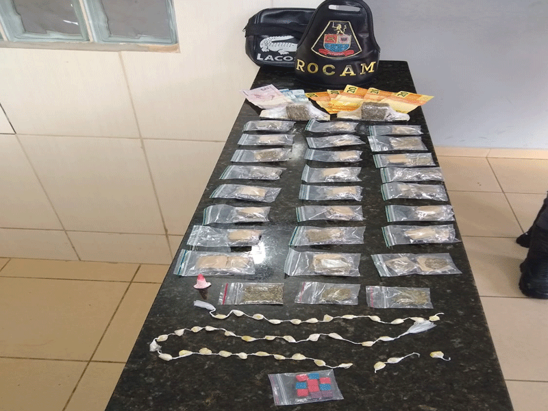 Segundo consta, o cabo Osmar e cabo David estavam em patrulhamento pelo CDHU, quando avistaram um jovem  no estacionamento do condomÃnio 2, bloco 4. O jovem jogou uma pochete ao solo e tentou fugir.  Na pochete foram localizados 03 papelotes de Skunk, 10 comprimidos de Ecstasy, 38 pedras de crack, 26 papelotes de maconha e R$ 109,00.  O adolescente foi encaminhado à Central de PolÃcia Judiciária, onde as drogas foram apreendidas e ele liberado para familiares.