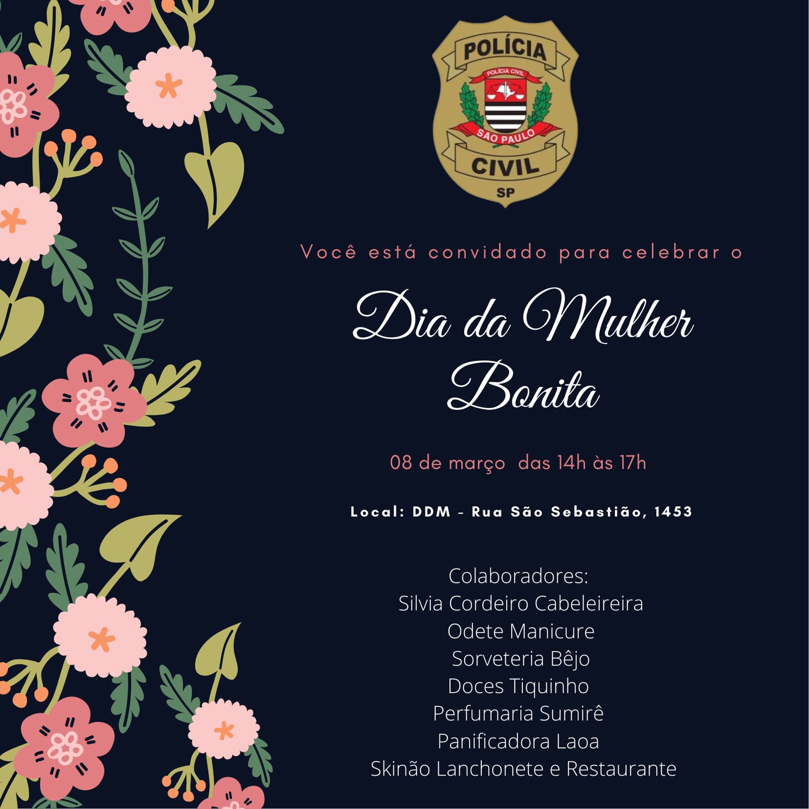 A PolÃcia Civil, através da Delegacia de PolÃcia de Defesa da Mulher , homenageará as mulheres no Dia Internacional da Mulher, realizando o Dia da Mulher Bonita . O evento será realizado no dia 08 de março das 14 as 17 horas na DDM , situada na Rua São Sebastião, 1453. As mulheres poderão cortar os cabelos com a Cabeleireira Silvia Cordeiro, e fazer as mãos com as experts Odete Manicure e Ailma Manicure. Também serão presenteadas com mimos ofertados pelos nossos colaboradores : Doces Tiquinho, Sorveteria Bêjo, Panificadora Laoa, Perfumaria Sumirê, Skinão Lanchonete e Restaurante. O evento visa fortalecimento da auto estima das mulheres vÃtimas de violência.