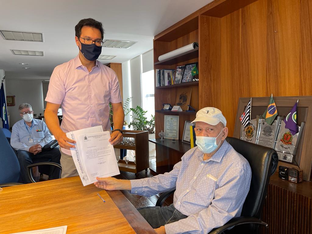 O prefeito Airton Garcia recebeu na tarde desta segunda-feira (21/03), em seu gabinete no Paço Municipal, a visita do deputado estadual Alex de Madureira, parlamentar que recentemente fez a doação, por emenda parlamentar no valor de R$ 180 mil, de uma ambulância. O veículo modelo Renault Master está sendo utilizada para fazer a alta hospitalar, o transporte de pacientes de baixa complexidade das UPAS para hospitais e de acamados que necessitam de tratamento específicos. O pedido da emenda parlamentar foi realizado pelo vereador Bira (Ubirajara Teixeira). O prefeito agradeceu o repasse realizado pelo parlamentar. “Agradeço muito todas as emendas que recebemos, isso ajuda muito os municípios que estão sem poder de investimento e com custeio cada vez mais alto”. Airton Garcia aproveitou e juntamente com a chefe de gabinete e responsável no momento pelo expediente da Secretaria Municipal de Saúde, Jôra Porfírio, entregou um ofício ao deputado pedindo R$ 200 mil para custeio de serviços da saúde. Na oportunidade o deputado Alex do Madureira prometeu o repasse dos valores para a saúde e disse que também está repassando cerca R$ 150 mil para a realização do Festival de Capoterapia, coordenado pelo Mestre Taroba. Acompanharam a reunião com o deputado estadual o chefe de gabinete da Prefeitura, José Pires (Carneirinho), o vereador Bira, as secretárias municipais Lucinha Garcia (Pessoa com Deficiência e Mobilidade Reduzida), Wanda Hoffmann (Educação), Helena Antunes (Gestão de Pessoas) e o secretário de Governo, Edson Fermiano.