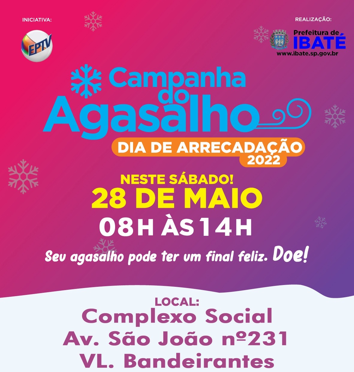 Neste sábado, 28 de maio, das 8h às 14h, será realizado o “Dia D” de Arrecadação da Campanha do Agasalho 2022, no Complexo Social, situado na avenida São João nº 230, Vila Bandeirantes. Realizado pelo Fundo Social de Solidariedade de Ibaté em parceria com a EPTV, a arrecadação será um dia de envolvimento regional com ações simultâneas em diversas cidades, para recolhimento de roupas e cobertores em bom estado de conservação.