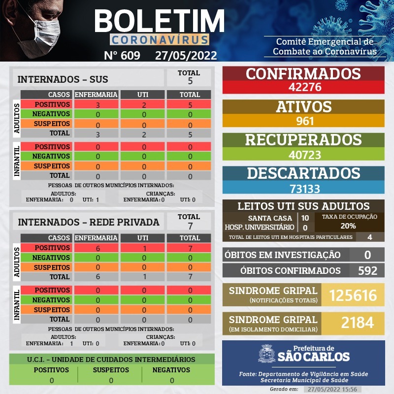 BOLETIM COVID-19 Nº 609 – 27/05/22 – São Carlos registrou mais um óbito por COVID-19 nesta sexta-feira (27/05), totalizando 592 mortes pela doença no município. O óbito é de uma mulher de 66 anos com comorbidades, internada na rede pública desde 16/05. A paciente já tinha recebido três doses da vacina contra a COVID-19. Foram registrados nesta sexta-feira (27/05) mais 212 exames positivos e 326 negativos para COVID-19. Nenhum paciente com COVID-19 está neste momento em leito de estabilização das UPAS.