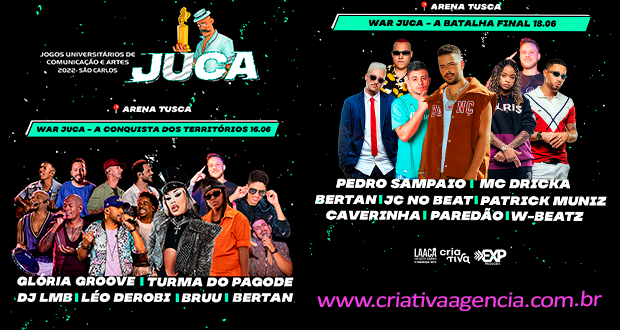 16/06 quinta-feira, das 17h às 6h – WAR JUCA: A conquista do território. GLÓRIA GROOVE, TURMA DO PAGODE, DJ LMB, LÉO DEROBI, BRUU, BERTAN. 18/06 sábado, 18h as 7h – WAR JUCA: A batalha final. PEDRO SAMPAIO, MC DRICKA, BERTAN, JC NO BEAT, PATRICK MUNIZ, CAVERINHA, PAREDÃO, W-BEATS. Será a primeira vez do Seu Juca na Arena TUSCA, participe você também. Os jogos nas praças serão gratuitos e, para adquirir ingressos para o WAR JUCA, acesse o site criativaagencia.com.br. É Criativa Agência. É São Carlos em Evidência.