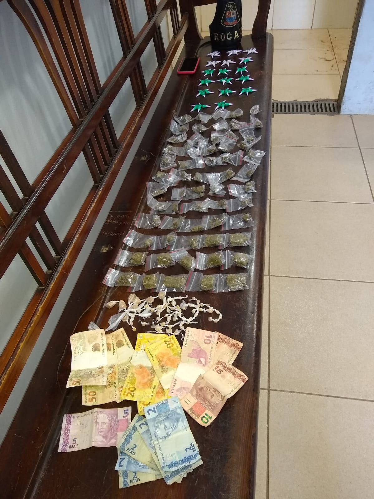 De acordo com informações, policiais militares da ROCAM e Força Tática estavam em operação pelo local, quando avistaram G.H.S, idade não informada, sentado em um sofá. Este ao ver os policiais, empreendeu fuga, levando consigo, uma sacola, a qual ele jogou em cima de uma  casinha. Os policiais detiveram o indivÃduo e apreenderam cocaÃna, crack , maconha e R$105,00. O detido foi encaminhado à Central de PolÃcia Judiciária, onde ficou à disposição da justiça.