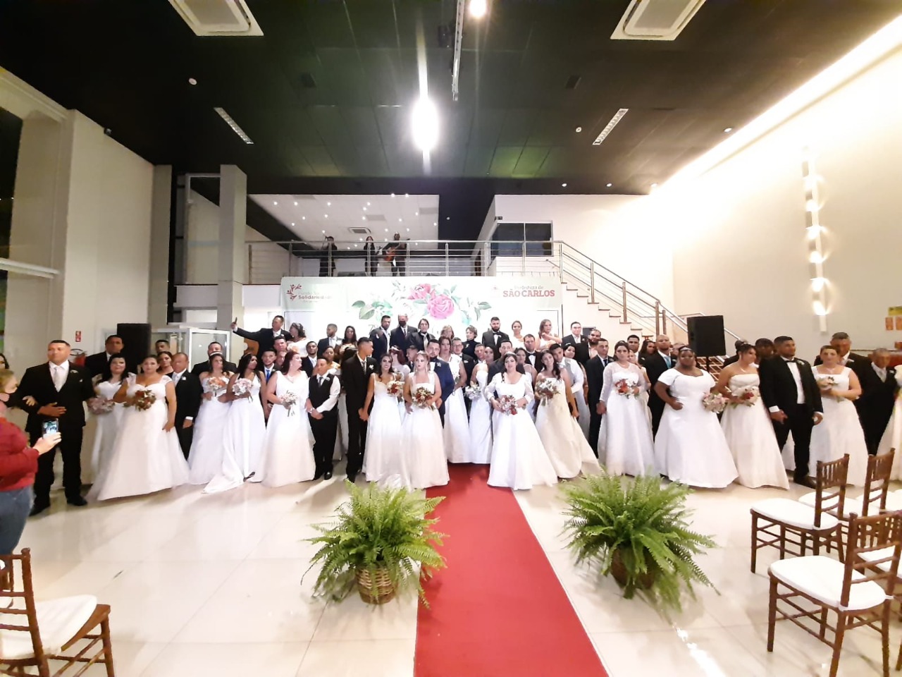 Uma quarta-feira inesquecível para 45 casais que oficializaram e celebraram a união no 7º Casamento Comunitário realizado pela Prefeitura de São Carlos, por meio Fundo Social de Solidariedade com apoio de vários parceiros. Ao som da marcha nupcial, os noivos realizaram o sonho da união com direito a decoração, vestido, terno, maquiagem, cabeleireiro, manicure, fotografia, bolo e espumante. A celebração aconteceu no Volentieri Festas e Eventos, um dos parceiros do Fundo Social. “É uma satisfação retomar essa cerimônia depois de dois anos sem poder realizar em virtude da pandemia. Muitos casais que estão oficializando a união agora se inscreveram em 2019, por isso é muito gratificante chegar aqui e ver a alegria dos noivos e seus familiares. A cerimônia é construída com parceiros que doam seu tempo e recursos para a concretização desse sonho”, disse Lucinha Garcia, presidente do Fundo Social de Solidariedade e madrinha dos casais. “Estou realizando meu sonho depois de 6 anos. Fui muito bem recebida pela  equipe do Fundo Social. Está tudo do jeito que imaginei. Estou realizada", disse Maria Simone do Nascimento Silva, que casou com Davi Rodrigues da Silva. O casamento comunitário possibilitou a Ana Paula Zanardi e a Jonathan Ferreira a oficialização da união. "Fizemos a inscrição de 2019, mas começou a pandemia e adiou nosso sonho por quase três anos. Eu não achava certo casar somente no civil, queria vestido de noiva, buquê e bolo e o Fundo Social nos deu a oportunidade", contou a noiva. “Nós estávamos querendo oficializar a nossa união e deu tudo certo para casarmos e realizarmos o nosso sonho. Foi um dia perfeito", afirmou Isaac Vieira, que casou com Claudinei da Silva Souza. Os noivos casaram ao som de Maria Butcher e André de Souza. A celebração do casamento foi feita por Sueli Martins de Oliveira. Participaram da celebração do  7º Casamento Comunitário, familiares dos noivos, secretários municipais e os vereadores Rodson Magno e Cidinha do Oncológico.