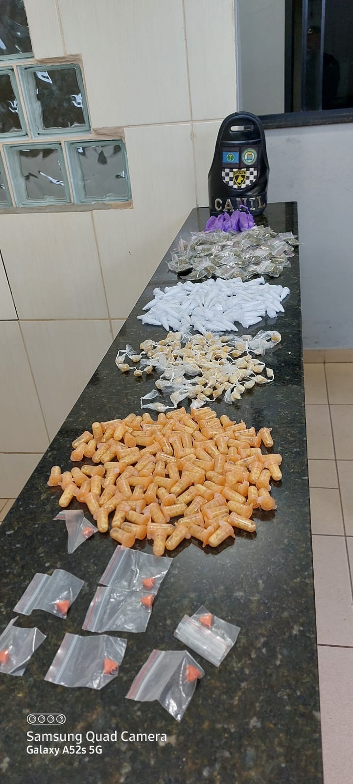 Segundo informações, a GM estava em patrulhamento, quando avistou um suspeito sair correndo de um local que é conhecido como ponto de drogas. Foi empregado o trabalho de faro com a K9 Índia, que logrou êxito em localizar em meio ao mato, uma sacola contendo 120 pinos de cocaína, 87 invólucros de maconha, 126 pedras de crack, 118 tabletes de crack e 8 comprimidos de êxtase. Todo material foi encaminhado à Central de Polícia Judiciária, onde foi apreendido.