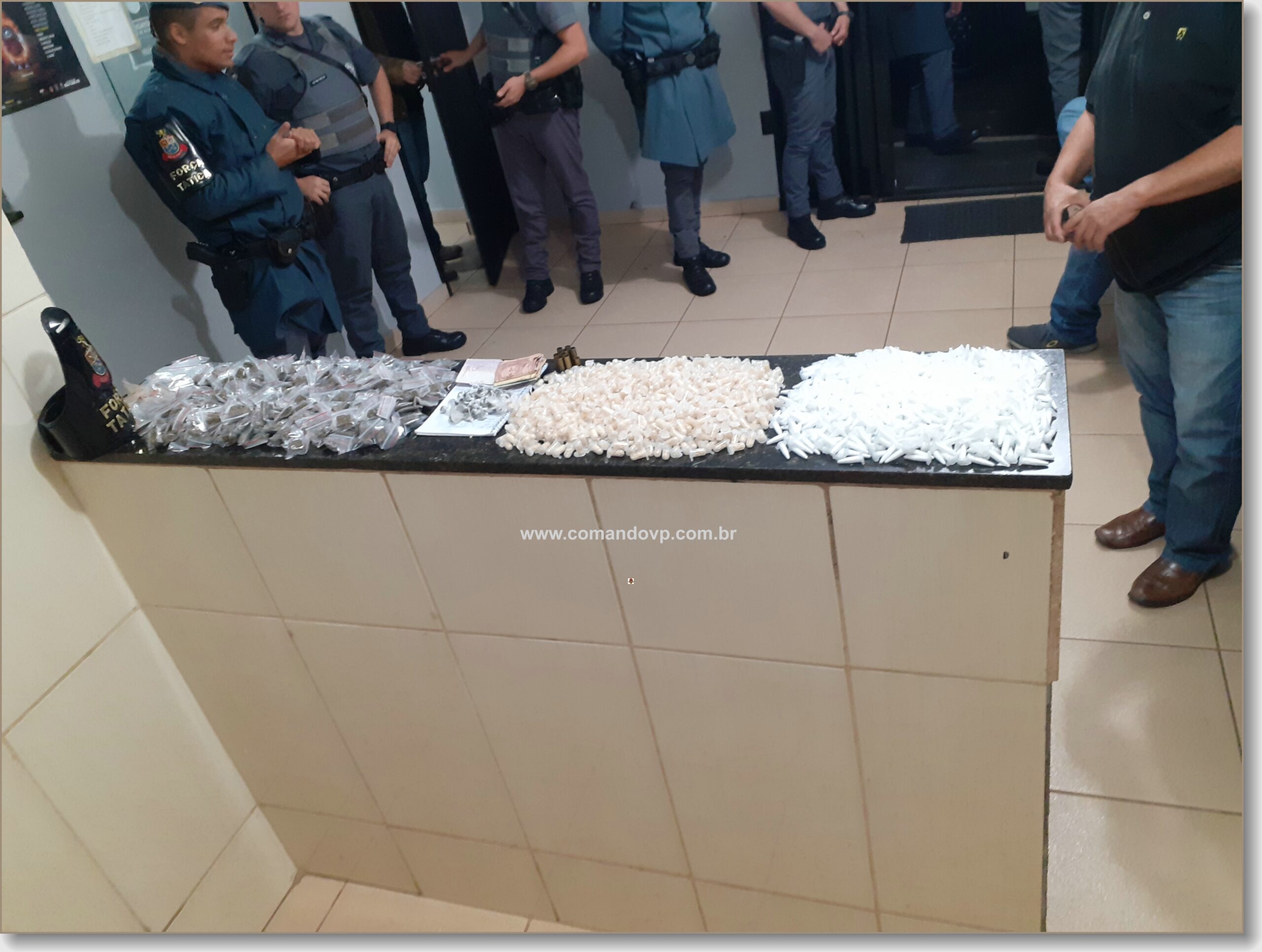 Segundo informações, as equipes de Força Tática foram para o local e tiveram a entrada franqueada pela mãe do suspeito. Debaixo da cama do  C.B.  B. F, de 25 anos,  foi encontrada uma  mochila contendo   caderno anotações do tráfico, 08 cápsulas de calibre  deflagradas,  01 cápsula 9 m  55 porções de  Haxixe, 721 pinos de cocaína, 242 porções de maconha, 107 comprimidos de ecstasy e R$ 359,00.