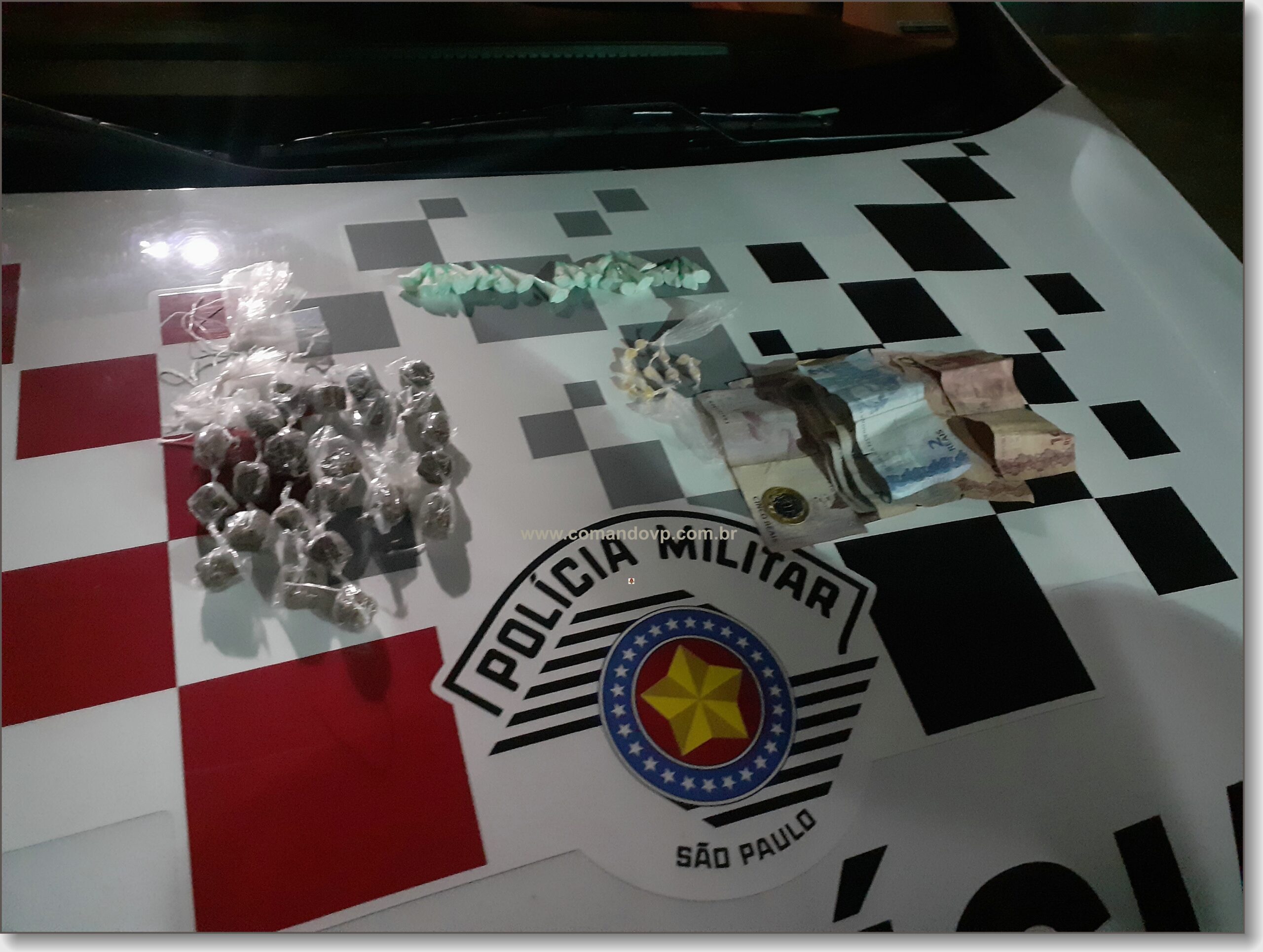 De acordo com informações, policiais militares estavam em patrulhamento pelo bairro Jd. Gonzaga, momento em que na Rua Guadalajara visualizaram  P.H.L.P, de 23 anos, em um local conhecido como ponto de tráfico. O suspeito  ao avistar a equipe tentou fugir, mas sem êxito. Realizado a busca pessoal,  foi localizado em suas vestes um saco plástico contendo pedras de crack, pinos de cocaÃna e papelotes de maconha. Em seu agasalho foram encontradas  02 porções de maconha e R$ 57,00. O jovem foi encaminhado para a Central de PolÃcia Judiciária, autuado em flagrante por tráfico de drogas pelo delegado, Dr. Gilberto de Aquino e recolhido ao Centro de Triagem de São Carlos.