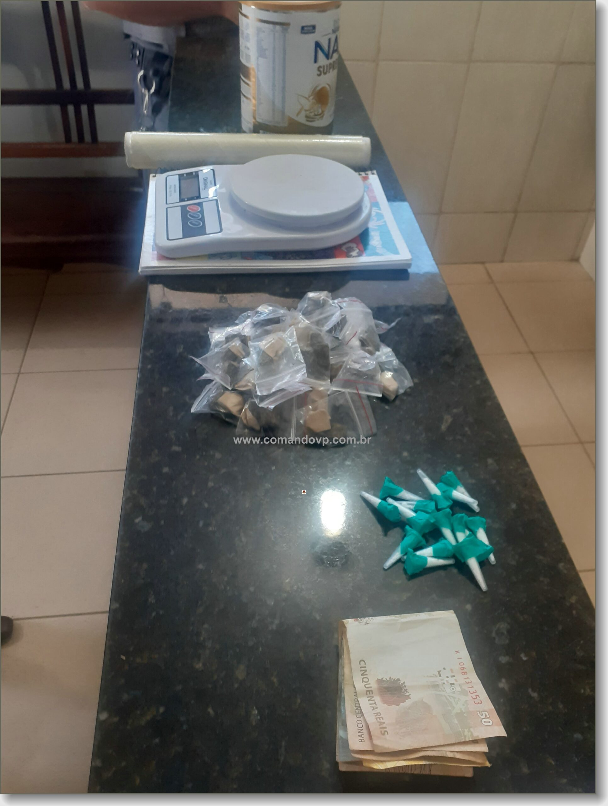 No imóvel os policiais encontraram dentro de uma lata de leite em pó 15 pinos de cocaÃna. No mesmo cômodo foi encontrada uma balança de precisão , um rolo de papel filme e um caderno de anotações. Dentro de um guarda roupa em um quarto,  os policiais encontraram R$ 174,00. No corredor da casa, foram localizadas 35 porções de maconha. Os três receberam voz de prisão em flagrante e foram encaminhados para a Central de PolÃcia Judiciária, onde foram autuados por tráfico de drogas pelo delegado, Dr. Miguel Capobianco Junior e recolhidos ao Centro de Triagem de São Carlos. O advogado, Dr. Arlindo BasÃlio esteve presente e acompanhou a ocorrência.