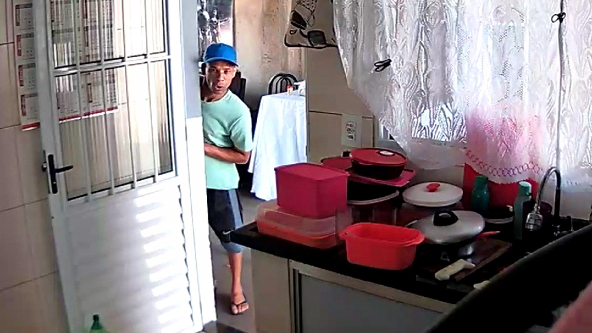 As imagens (abaixo) mostram quando o ladrão entra pela porta da cozinha, que estava aberta. Ele para na porta, fica observando o interior da casa por alguns segundos e segue para um dos quartos (a imagem não mostra), onde estava o aparelho de TV. Depois de alguns minutos o ladrão voltar a aparecer no vídeo saindo da casa com a televisão de 49 polegadas. Nos pés, o bandido ainda tinha um par de tênis do filho da Gisleide. “Ainda nem terminei de pagar. Meu filho usou duas vezes”, disse a vítima.