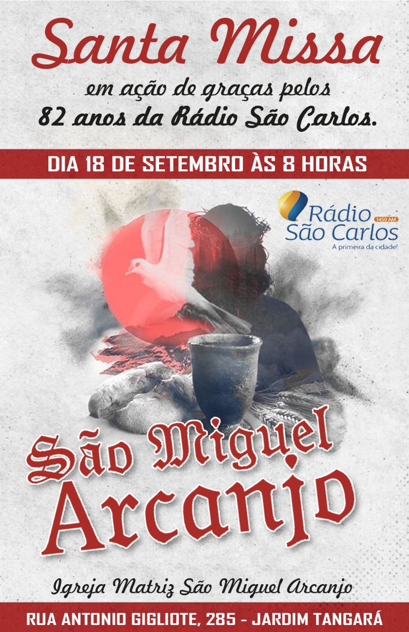 A Rádio São Carlos convida a todos, para a missa em louvor ao aniversário de 82 anos.   Rádio São Carlos am 1450 khz. A direção da Rádio São Carlos agradece a todos, pelo ato de amor e carinho .