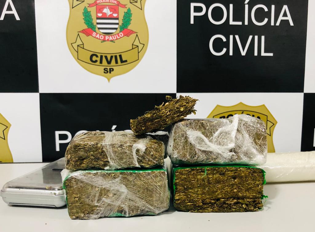 No local foram apreendidas duas frações de tijolos de maconha e mais quatro porções da mesma droga. Também foram localizados apetrechos para o embalo do entorpecente (balança de precisão e plástico filme).