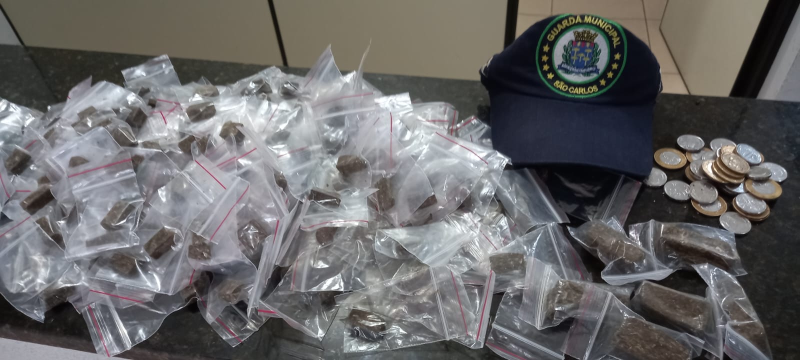 A GM apreendeu drogas nesta quarta-feira, 11/01/2023, na Rua João Paulo, cruzamento com a Rua Antônio Bustos Alabarka, bairro Cidade Aracy, São Carlos-SP.