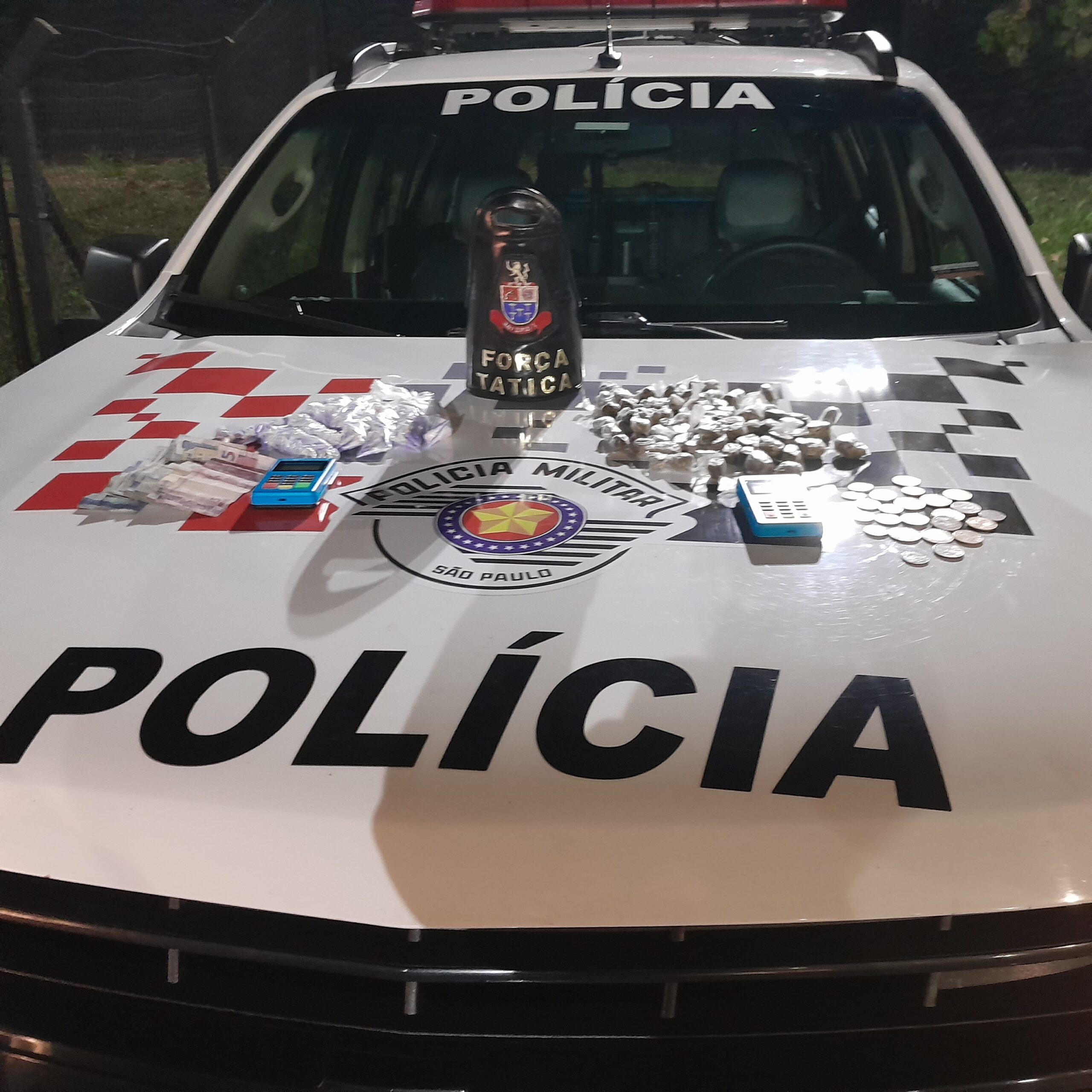 Segundo informações, policiais militares da Força Tática estavam em patrulhamento pela Rua Conselheiro Soares Brandão, bairro Vila Pureza, quando viram dois indivÃduos entregando algo para um motociclista. Os dois indivÃduos foram abordados e o com eles foram   localizados 134 pinos de cocaÃna, 86 porções de maconha, duas máquinas de cartão e R$ 37,00.  O sujeito da moto fugiu. L.S.M, 34 anos e J.S.G, de 31, foram encaminhados para a Central de PolÃcia Judiciária, onde foi autuados em flagrante pelo delegado, Dr. Adriano Callsen Alexandrino e recolhidos ao Centro de Triagem de São Carlos.