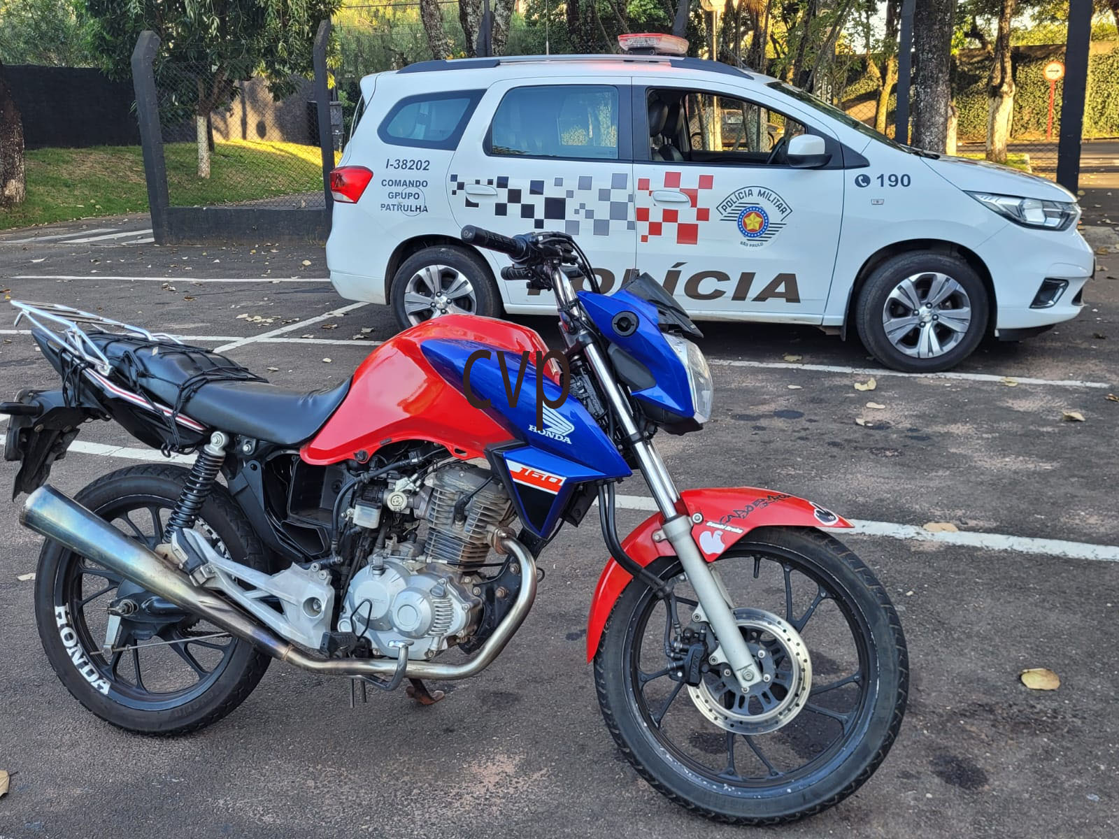 De acordo com boletim de ocorrência, a PM foi comunicada do furto da moto e os policiais Pascoalino e Mariana fizeram contato com a vÃtima. Neste momento os policiais receberam denúncia que a moto furtada estaria na garagem de uma casa na Rua Rodolfo Luporine, bairro Jd. Paulistano. Os policiais foram ao local e viram a moto na garagem. Uma mulher recebeu os policiais e disse desconhecer de quem era a moto. Ela disse que dois indivÃduos de 19 anos também estavam dormindo no local. Ambos foram acordados e S.S.G, disse que havia comprado a moto de um usuário de droga pelo valor cem reais e que tinha ciência que a mesma era furtada. Já R.H.W, disse que não sabia nada a respeito da moto. Através da filmagem das câmeras de segurança, foi possÃvel ver os dois na pratica do furto.  A dupla foi encaminhada para a Central de PolÃcia Judiciária, autuada em flagrante e recolhida ao Centro de Triagem de São Carlos.  A moto foi devolvida para a vÃtima.