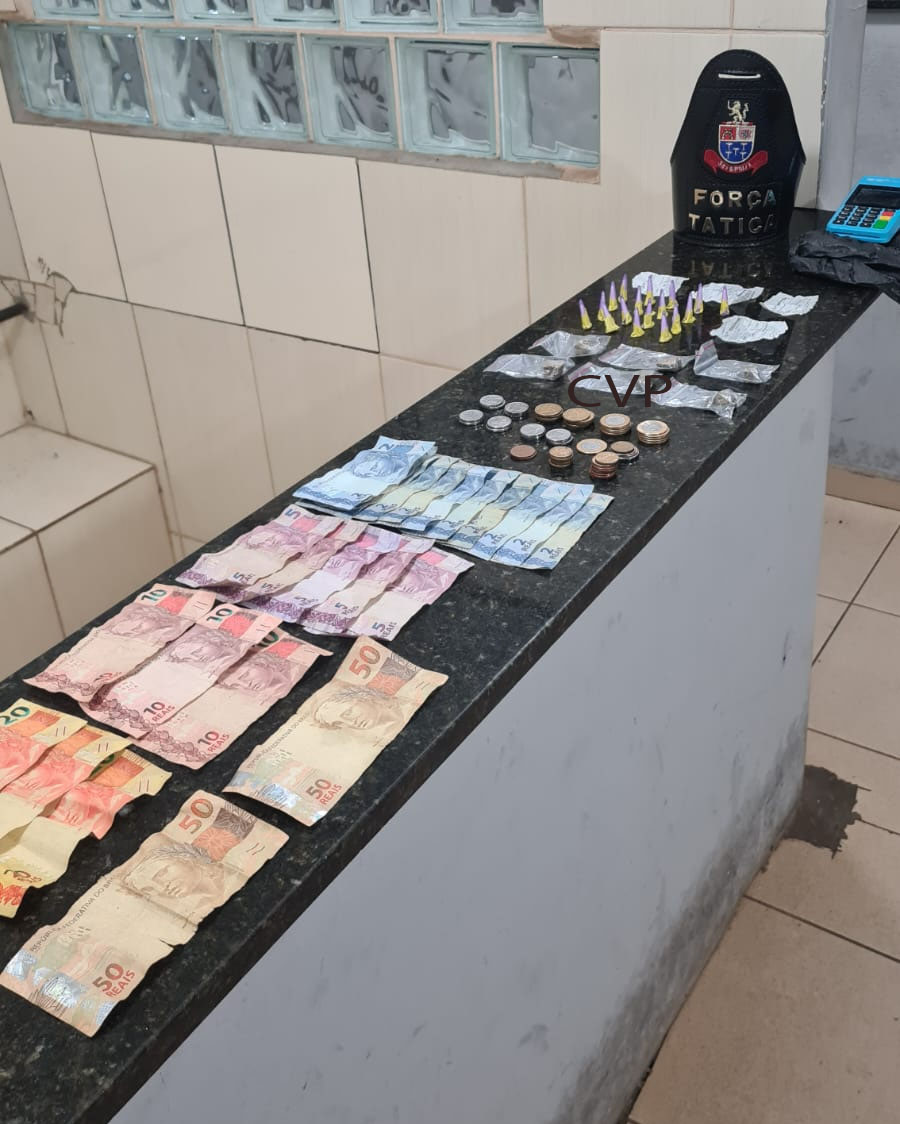 De acordo com informações, policiais militares da Força Tática, o tenente Lourenço, cabo Cesar e soldado Ederson estavam em patrulhamento preventivo, quando avistaram um suspeito. Este estava com uma sacola e tentou fugir, mas acabou detido. Na sacola foram localizados 17 pinos de cocaína, 6 porções de maconha, uma máquina de cartão de crédito e R$ 258,10.