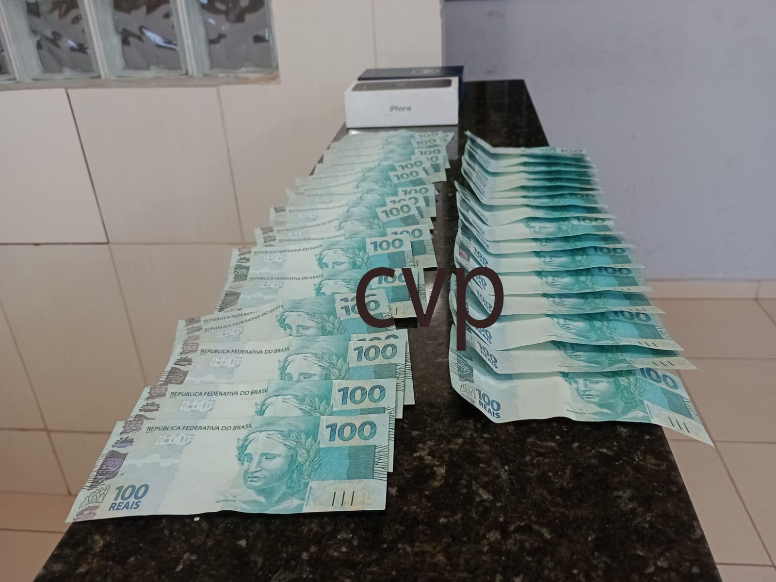 De acordo com informações, a PM foi informada que uma pessoa havia vendido um celular e teria recebido o pagamento em notas de cem reais falsas. Depois esta vÃtima viu que o celular que ela havia vendido estava sendo oferecido nas mÃdias sociais. A vÃtima então marcou de comprar o celular e foi até o estacionamento de uma loja na rodovia Washington LuÃs, porem avisou a PM. Quando os indivÃduos chegaram em um veÃculo Peugeot, foram detidos. Com eles foi localizado o celular e a quantia de  R$ 3.900,00 em notas de cem reais falsas.