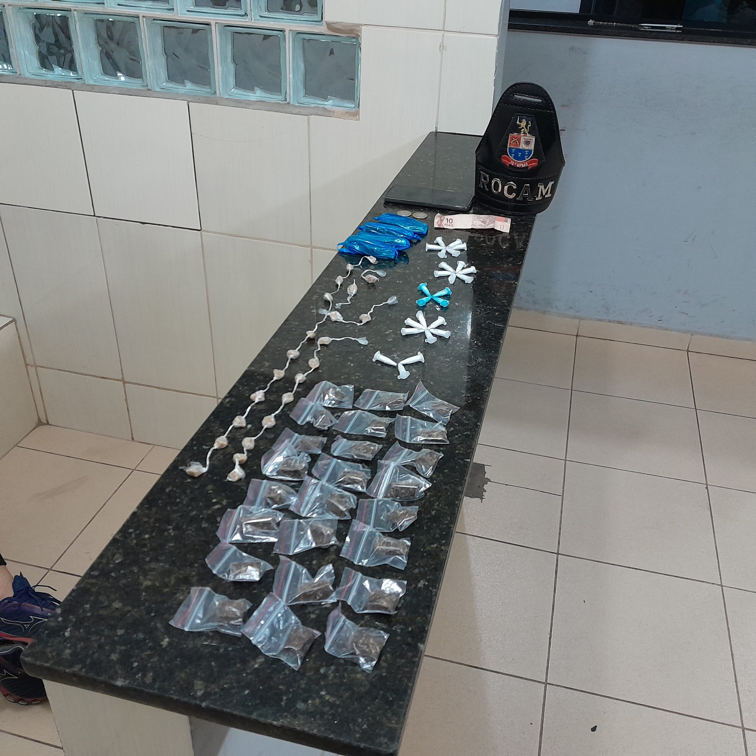 De acordo com informações, o cabo Gigante e cabo Soares, estavam em patrulhamento, momento que avistaram H.S.A, 19 anos, o qual saiu correndo e jogou uma sacola no telhado de um sobrado. Na sacola foram localizados 25 pinos de cocaína, 23 porções de crack, 28 porções de maconha, 12 reais e um celular. A ocorrência foi encaminhada para a Central de Polícia Judiciária, onde o detido ficou à disposição da justiça.