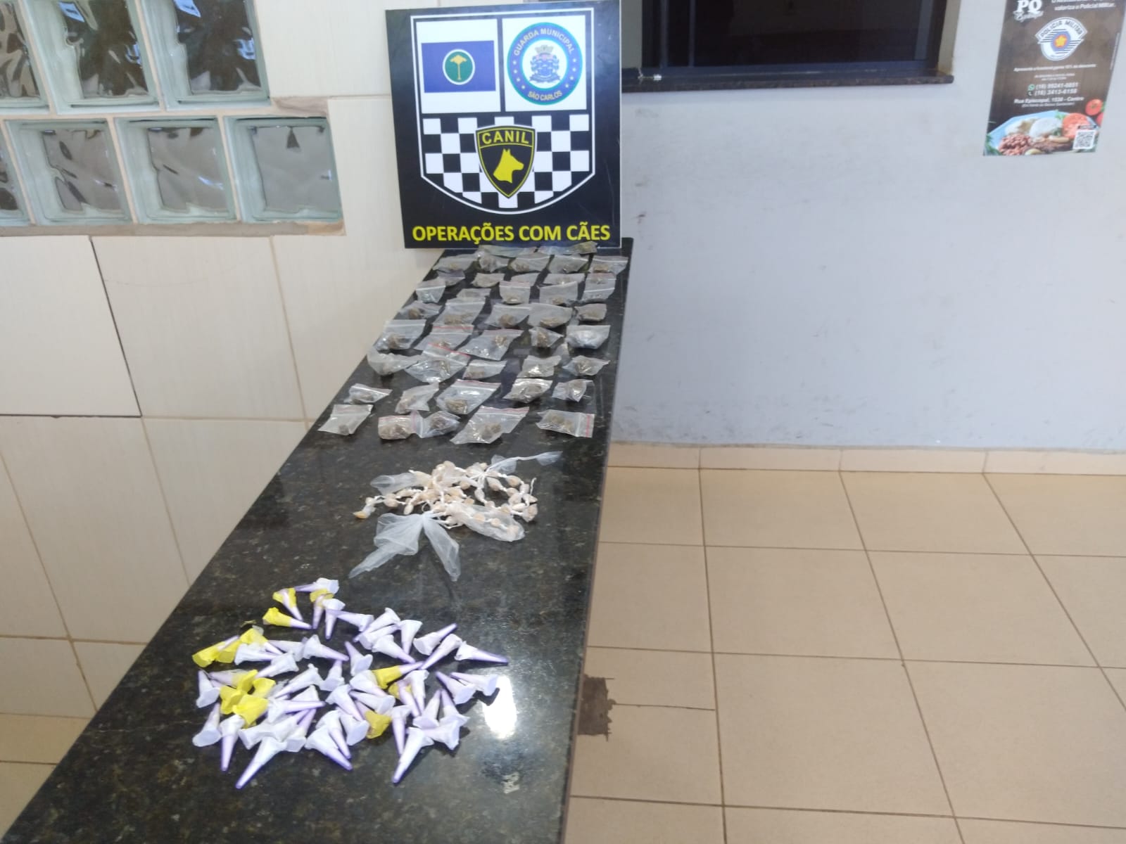Segundo informações, a GM estava em patrulhamento, momento que um indivíduo fugiu correndo. O cão farejador K9 Índia logrou êxito em localizar uma sacola contendo, 53 pinos de cocaína, 42 invólucros de maconha e 59 pedra de crack. Tudo foi encaminhado para a Central de Policia Judiciária, onde foi apreendido.