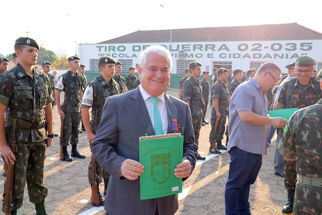 Em cerimônia realizada na manhã desta sexta-feira (25), nas dependências do Tiro de Guerra 02-035, em comemoração ao Dia do Soldado, o presidente da Câmara Municipal, vereador Marquinho Amaral, recebeu a Medalha Mérito do Tiro de Guerra e diploma em reconhecimento aos relevantes serviços prestados à cidadania e ao civismo. A solenidade teve presenças do Chefe de Instrução Tiro de Guerra, Subtenente Julio Cezar de Alencar, do  1º Sargento Edson Roberto Polli, do vereador Robertinho Mori, do engenheiro José Guilherme Sabe e do secretário de Segurança Pública, Samir Gardini, que representou o prefeito Airton Garcia. A medalha de mérito do Tiro de Guerra foi instituída no ano de 2007 em comemoração aos 105 anos da criação do primeiro Tiro de Guerra do Brasil, na cidade de Rio Grande (RS), com a fundação de uma sociedade de Tiro ao Alvo com finalidade militar. A honraria se destina a premiar civis e militares que, por abnegação, dedicação e capacidade profissional, desenvolvem os valores espirituais e morais da nacionalidade e o sentimento de obrigações para com a pátria,contribuindo para fortalecer a cidadania. A  medalha simboliza a gratidão e o reconhecimento pelo trabalho desenvolvido em prol da nossa nação e fortalecimento do Tiro de Guerra no município de São Carlos. Ao agradecer a homenagem, Marquinho Amaral destacou a importância de valorizar as datas cívicas, hoje pouco conhecidas pelas crianças e jovens, afirmando que “não podemos nunca nos esquecer do passado, pois se nós aqui estamos hoje com  democracia, comemorando uma significativa data, é porque nós tivemos heróis que tombaram nas trincheiras, perderam seus familiares e suas próprias vidas em defesa da nossa amada pátria nosso querido Brasil”. Lembrou que há muito tempo  a Câmara Municipal tem sido parceira do TG 02035. “Muitas conquistas, muitas obras e melhorias foram feitas através da economia de recursos do duodécimo da Câmara e também por meio de emendas parlamentares. Fez referência a uma perua Kombi, carro e maquinário destinados à corporação no passado e as doações feitas nesta sexta-feira. Marquinho e o vereador Robertinho Mori entregaram ao Tiro de Guerra uma impressora e um instrumento musical  (este doado mediante emenda parlamentar do vereador Robertinho). Marquinho afirmou que em breve nas dependências do Tiro de Guerra será instalada a sede da Junta do Serviço Militar “para facilitar a vida dos jovens que num mesmo local cumprirão com suas obrigações militares”.  O presidente da Câmara ressaltou que recebeu a homenagem em nome dos vereadores, “como um reconhecimento ao Legislativo, instituição democrática que ouve a população e, muitas vezes, recebe críticas de quem que não a conhece; quem conhece e acompanha os trabalhos da Câmara sabe que os vereadores estão dedicados a trabalhar pelo nosso Brasil”. “Durante meus mandatos sempre fui e continuarei sendo um parceiro e amigo do Tiro de Guerra”, afirmou Marquinho em sua rede social, observando que assim segue os passos de seu pai, Francisco Xavier Amaral Filho e de seu irmão, Samuel Amaral, que exerceram cargos de presidente e diretor geral da Câmara, oferecendo grande apoio às atividades da instituição militar. Fotos Presidente da Câmara foi homenageado pelo Tiro de Guerra durante comemoração alusiva ao Dia do Soldado