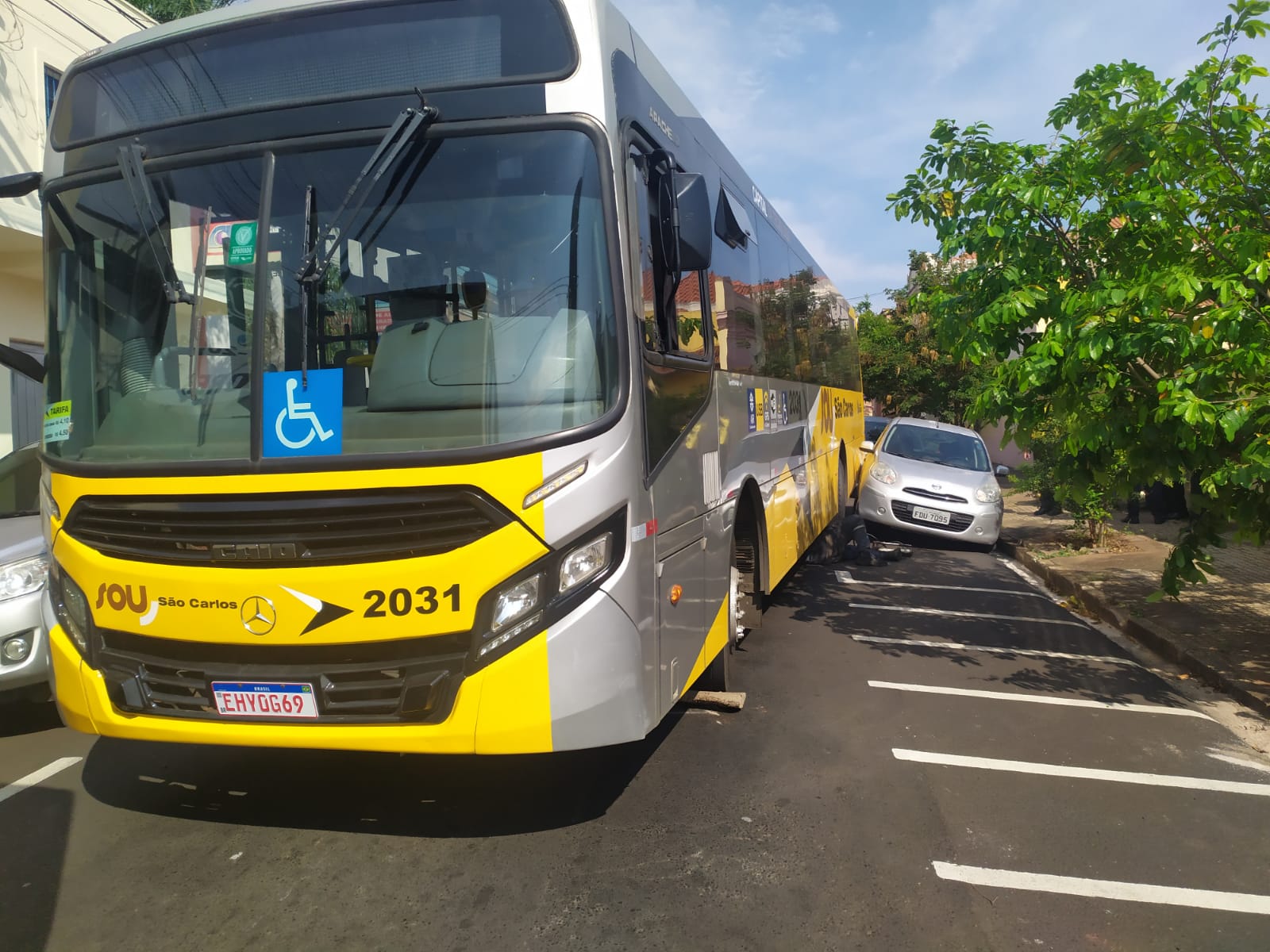 Um ônibus da empresa Rigra atingiu dois carros nesta manhã de quarta-feira, 6 de setembro de 2023, após ter quebrado o eixo na Rua Santa Cruz, região central de São Carlos-SP.