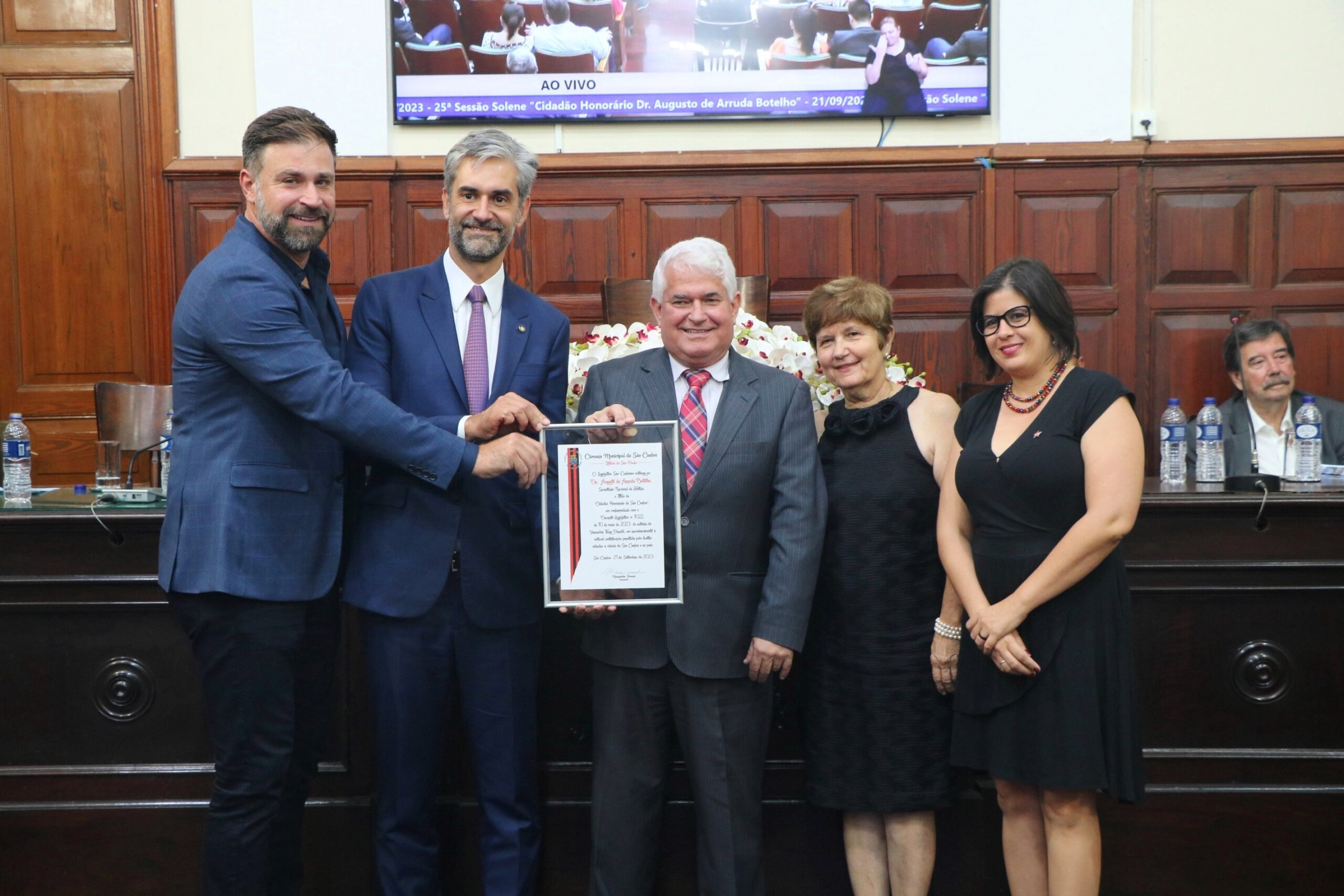 A Câmara Municipal de São Carlos entregou nesta quinta-feira (22) em sessão solene o título de Cidadão Honorário de São Carlos ao secretário nacional de Justiça, Augusto de Arruda Botelho, em reconhecimento à notável contribuição prestada ao município e ao país. A concessão do título foi oficializada pelo Decreto Legislativo No. 1022, de autoria do vereador Tiago Parelli, com aprovação unânime do plenário.