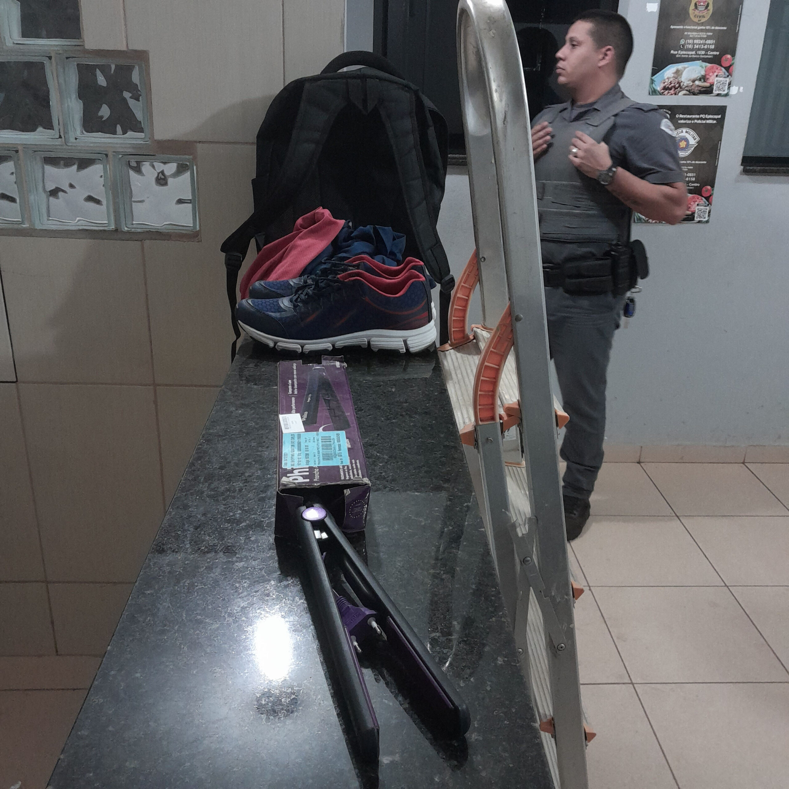 De acordo com boletim de ocorrência, o menor de idade, vêm praticando diversos furtos em residências. Através de imagens de câmeras de segurança, um cabo da Polícia Militar Rodoviária, viu o suspeito na calçada. O policial deteve o adolescente e acionou uma viatura da infantaria. O menor confessou os furtos e disse que parte dos objetos, ele havia vendido para desconhecidos. O abordado levou a PM na casa de um dos receptadores, onde foi localizada uma escada. Já na casa do adolescente, foi encontrado uma chapinha de cabelo, um par de tênis e duas camisetas, todos furtados. O menor foi encaminhado para a Central de Polícia Judiciária e entregue para a família.