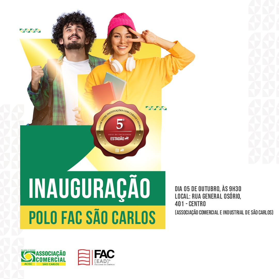 No dia 05 de outubro, às 9h30, acontecerá na ACISC (Associação Comercial e Industrial de São Carlos) a inauguração do Polo FAC São Carlos, a Faculdade do Comércio, sendo ela a faculdade oficial dos comerciantes e empresários. Desde sua abertura, há 2 anos já foram conquistados diversa unidades em 12 estados brasileiros, como Espírito Santo, Maranhão e Rio Grande do Sul, estando ativos todos os 110 polos atualmente. Já se passaram mais de 2mil alunos desde a abertura, e hoje, possui mais de 1.700 alunos, dos mais diversos cursos, como Gestão Comercial e Ciências Contábeis, além dos cursos de pós-graduação. A faculdade possui a nota máxima de 5 estrelas no MEC (Ministério da Educação), além de estar em 5° lugar no Guia do Estadão de Faculdades 5 estrelas. Localizado na Associação Comercial, o Polo São Carlos já tem sua primeira aluna matriculada. Greice Aparecida Ferreira, escolheu o curso de Gestão de Marketing para se especializar e iniciará as aulas no dia 02 de outubro, mas para quem quiser se inscrever e começar ainda neste semestre, terão até o dia 30 de outubro para realizar a matrícula. Na inauguração o Presidente da Associação, José Fernando Domingues estará presente, prestigiando esse momento, juntamente dos Diretores Executivos e do Diretor Geral da FAC, Wilson Victorio e do Coordenador dos Polos, Wellington. O convite do evento foi direcionado a toda imprensa da cidade, além de todos que quiserem conhecer o polo e celebrar conosco.