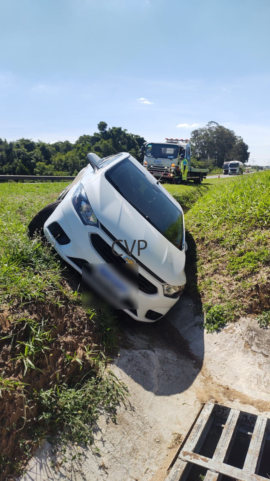 Nesta tarde de domingo, 22 de outubro de 2023, um carro foi parar na vala de água pluvial no km 219 da rodovia Washington Luís, região do posto Castelo, São Carlos-SP.