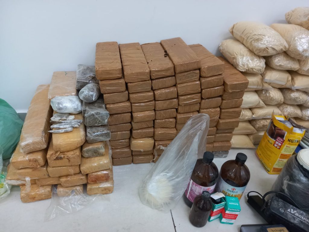Indagado, o jovem disse que havia pegado a droga em uma casa na rua Paulo Elias Antônio, os policiais da Força Tática foram até o imóvel e viram uma mulher saindo de um veículo foi feita abordagem, quando um jovem fechou o portão e perguntou o que estava acontecendo. O morador da residência foi informado sobre a presença da polícia na residência e confessou que tinha grande quantidade de drogas no local e autorizou a entrada dos policiais. Durante vistoria, foi encontrado grande quantidade de tijolos de maconha, pinos de cocaína, materiais para refino e máquinas para embalo dos entorpecentes.