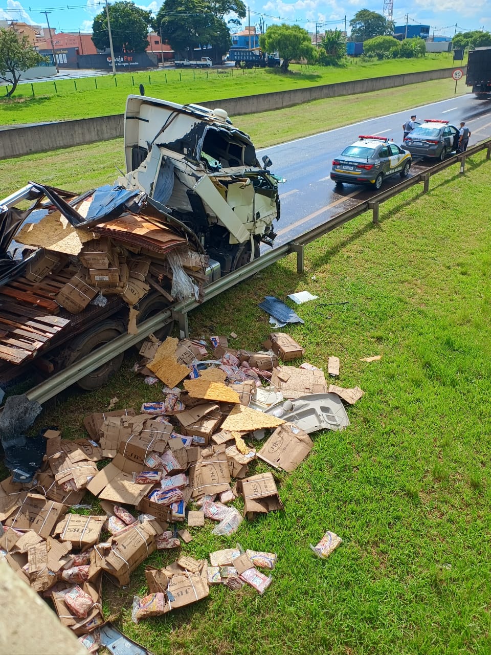 Parte da carga de um caminhão ficou espalhada nesta tarde de quinta-feira, 18 de janeiro de 2024, na rodovia Washington Luís, próximo da base da Polícia Rodoviária, São Carlos-SP.