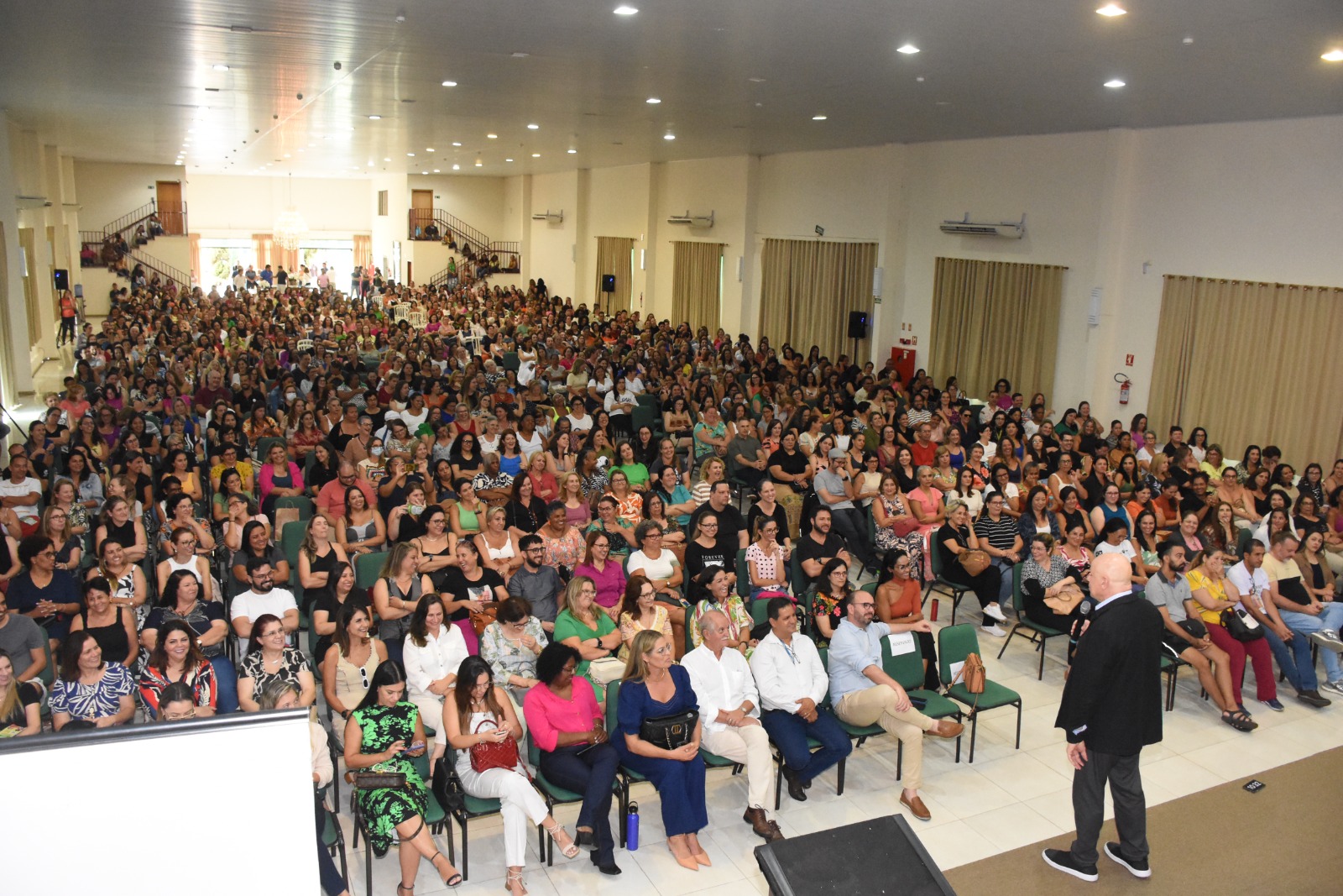 A Secretaria Municipal de Educação (SME) realizou nesta sexta-feira (02/02), no anfiteatro do Hotel Nacional Inn, o acolhimento de todos os profissionais da rede municipal de ensino, incluindo professores da Educação Infantil, do Fundamental I, do Fundamental II, da Educação de Jovens e Adultos (EJA), merendeiras, agentes educacionais, auxiliares administrativos, diretores e coordenadores. O secretário municipal de Educação, Roselei Françoso e o secretário municipal de Governo Netto Donatto, representando o prefeito Airton Garcia, deram as boas-vindas aos profissionais da Educação e abriram oficialmente o ano letivo 2024 na Rede Municipal de Ensino. Para essa aula inaugural de apresentação do calendário letivo e de projetos que serão desenvolvidos em 2024, a SME trouxe para palestrar o professor, historiador e apresentador Leandro Karnal que falou sobre o tema “Educadores: construindo futuros”. Ainda na sexta-feira (02/02), às 19h, no Auditório Bento Prado Júnior, no Paço Municipal, aconteceu a palestra com Sônia Couto. Antes da palestra foi apresentado aos profissionais da Educação o novo Sistema de Gestão Educacional com orientações sobre como será operacionalizado o diário eletrônico, lista de presença, matricula online, diário de classe e como será feita a formação dos profissionais que também receberam um folheto com a relação dos Cursos de Formação e Bem-Estar, 1º semestre 2024, realizado em parceria com a Fundação Educacional de São Carlos (FESC), com inscrições abertas a partir do próxima segunda-feira (05/02). O secretário municipal de Governo, Netto Donato, ressaltou que esse é o segundo ano consecutivo que ele participa da abertura do ano letivo. “Muita coisa mudou para melhor, talvez não tenha existido na história de São Carlos um governo que mais contratou professores e profissionais da educação como o atual. São mais de 250 professores efetivos, o compromisso do nosso governo é falar pouco e fazer muito. Problemas existem e tem coisas para melhorar, mas está andando porque hoje temos mais infraestrutura e material humano. O passado deixou suas marcas que precisamos agradecer, só que não podemos viver do passado, precisamos olhar para o futuro, ter novas ideias para continuarmos oferecendo uma educação de qualidade”, disse Netto. O secretário de Educação, Roselei Françoso, destacou que o balanço do ano de 2023 é positivo com melhorias no sistema de gestão educacional e muitas conquistas como a reforma do Estatuto da Educação, regulamentando de vez a função de apoio e substituição de coordenador pedagógico na proporção de um para cada quatro escolas, também foi realizado o concurso público de merendeiras, reforma nas unidades, cursos de formação continuada em parceria com a FESC para cuidar da saúde do trabalhador. “Em 2024 já efetivamos novos professores, continuaremos reformando e construindo novas escolas, serão contratadas 27 salas modulares para atender algumas metas do Plano Municipal de Educação, já estão sendo adquiridos notebooks para os novos professores, TVS de LED 50 polegadas para escolas e tablets para os alunos do sexto ao novo ano. Vamos inaugurar o CEMEI Flávio Ciacco, além da entrega de uniformes e material escolar. A ideia é pensar a Educação a partir do professor em sala de aula”, finalizou Roselei. “Nós professores, especialmente do ensino fundamental e da pré-escola, nós temos uma grande dificuldade, o mundo mudou no pós pandemia, desafios tecnológicos, sociabilidade das crianças e adolescentes voltadas para as redes sociais e não para a interação direta e os desafios dos professores com a diversidade. Então nós temos muito o que discutir entre educadores. Eu não tenho as respostas prontas, eu não sei exatamente quais são os caminhos. Mas tenho plena confiança que as professoras e os professores de São Carlos, discutindo em conjunto, em eventos como esse, podem achar bons caminhos”, disse Leandro Karnal. Na segunda-feira (05/02), também será feito o planejamento e na terça (06/02), retornam as aulas. No total serão atendidos cerca de 17 mil alunos. Fazem parte da Rede Municipal 62 unidades escolares, sendo 51 Centro Municipais de Educação Infantil (CEMEI’s), 10 Escolas Municipais de Ensino Básico (EMEB’s) e 1 Escola Municipal de Jovens e Adultos (EMEJA). Para atender toda a Rede a Prefeitura tem hoje disponíveis cerca de 1.600 profissionais entre professores, diretores, supervisores, coordenadores pedagógicos, agentes educacionais e merendeiras. Também participaram do acolhimento dos profissionais da Rede Municipal de Ensino, o secretário municipal de Comunicação, Leandro Severo, o presidente da FESC, Eduardo Cotrim, Gilberto Rodrigues, diretor sindical representando o presidente do SINDSPAM, Adail Toledo, a secretária adjunta de Educação, Paula Knoff e o diretor do Departamento Pedagógico, Paulo Roberto da Silva, entre outros diretores e gestores da SME.