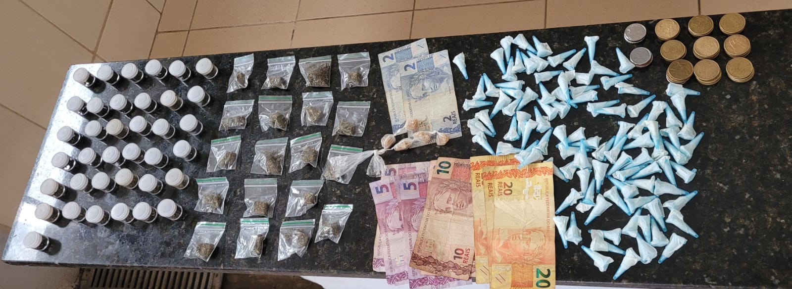No total foram apreendidos 98 pinos de cocaÃna, 56 porções  de maconha, 05 pedras de crack e R$ 115,00. Os policiais encaminharam B.H.L.O, de 18 anos, para a Central de PolÃcia Judiciária, onde ficou à disposição da justiça.