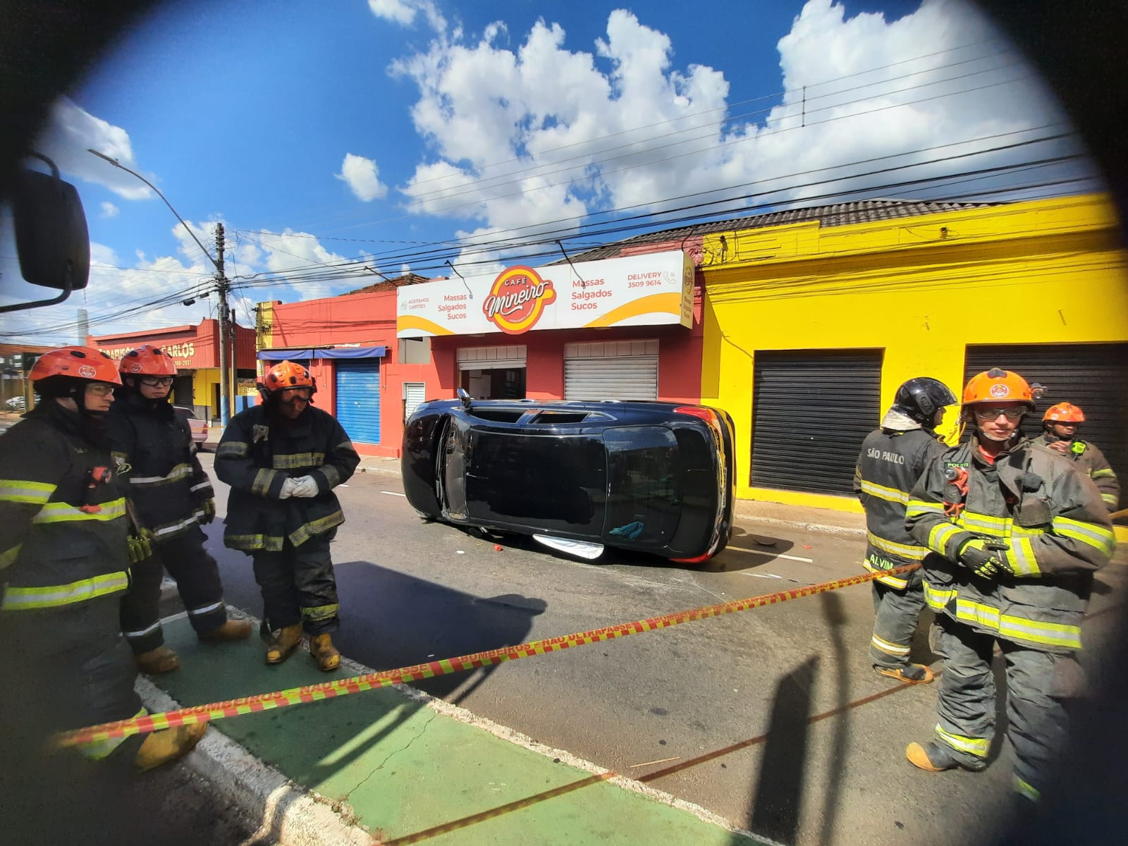 Um Versa tombou nesta tarde de sábado, 16 de março de 2024, após colidir em outros dois veículos na Avenida São Carlos, região da Praça Itália, São Carlos-SP.