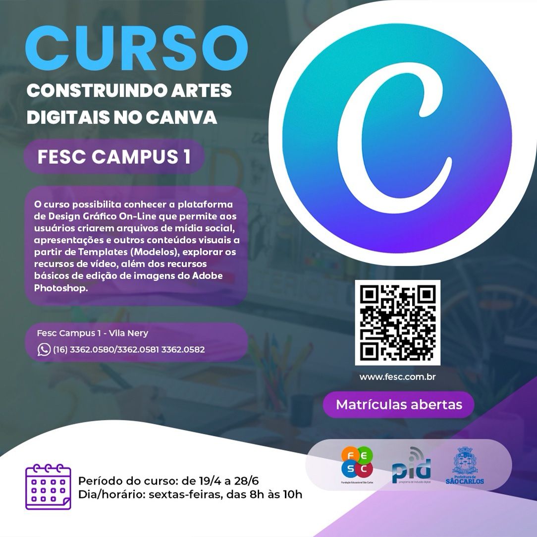 A Fundação Educacional de São Carlos (FESC) informa que está com inscrições abertas para os cursos de Canva - Construindo Artes Digitais, Matemática para o Vestibulinho e Teclado para Iniciantes, além de aulas de longevidade com qualidade de vida - movimento e saúde, ritmos brasileiros - corpo e canto em movimento e de Yoga.