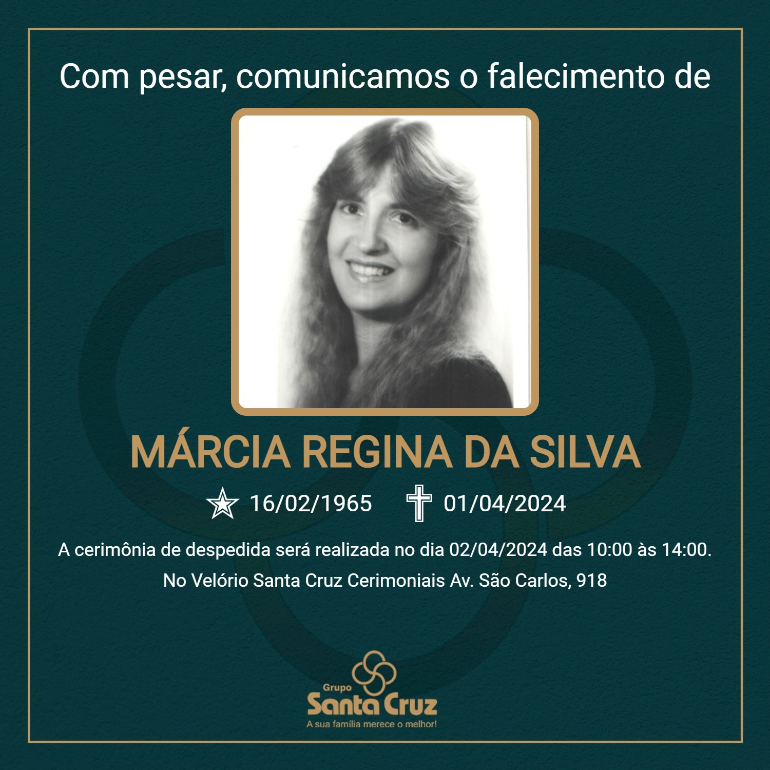 É com profundo pesar e dor, que comunico o falecimento da nossa querida Márcia Regina da Silva, ocorrido nesta noite. A Márcia não é só uma amiga do dia a dia, ela foi uma mãe e uma irmã em muitos momentos, sua alegria contigiava desde cliente aos amigos. Lutou, lutou e lutou bravamente até o fim sem ao menos reclamar de nada. Amava incondicionalmente sua família e seus animais, sem se esquecer das suas plantas. Em nossa última conversa, ela me disse: "sou guerreira e vou aceitar tudo que tiver que aceitar". Hoje numa fração de segundo, com serenidade assim como uma "vela que se apaga", nossa Márcia, entregou sua vida nas mãos de Deus onde não haverá mais dor nem sofrimento pois ela completou seu ciclo, sua missão e sua Páscoa. "Combati o bom combate, terminei a corrida, conservei a fé. E agora já está reservada para mim a coroa da justiça, que o Senhor, o justo juiz, me dará naquele Dia" (2Tm4,7-8).