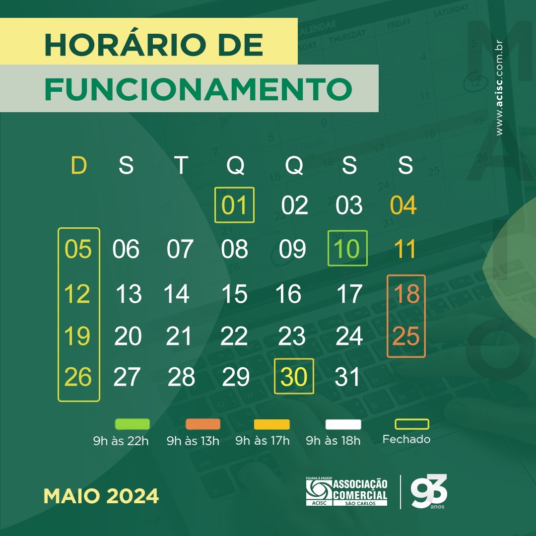 ACISC informa Horário do Comércio de São Carlos no mês de Maio