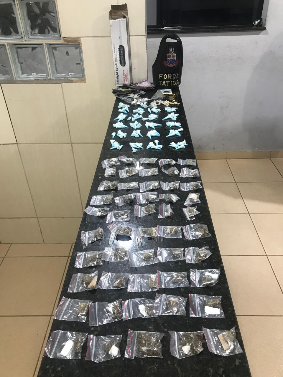 De acordo com informações, os policiais estavam em patrulhamento, quando avistaram um indivíduo agachado mexendo em uma caixa de papelão. Este ao ver que seria abordado, tentou sair do local,mas sem êxito. Com D.H.M, foram localizados R$56,70. Na caixa foram encontrados 109 pinos de cocaína, 50 porções de maconha, 17 pedras de crack e 08 de haxixe.