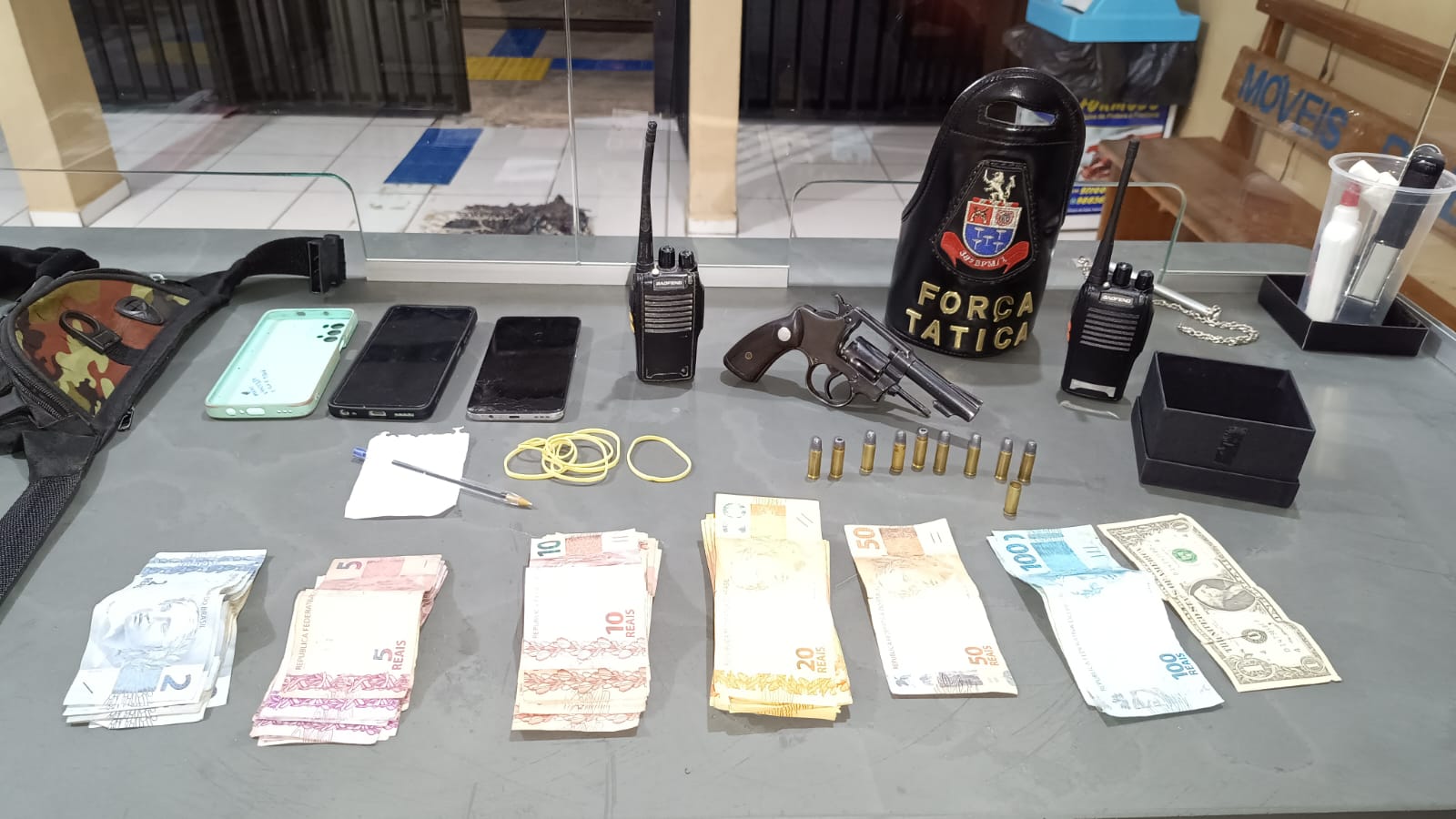 De acordo com informações, uma viatura da Força Tática, composta pelo sargento  Wanderson, cabos Osmar, Neto e soldado  Ederson, estava em patrulhamento, momento que um sujeito em uma moto empreendeu fuga, mas foi acompanhado e abordado na garagem da casa dele na Rua Antônio Borelli Thomaz. Com o averiguado foi localizado um rádio HT, usado somente para comunicação entre traficantes, celular, elásticos  ( usados em dinheiro) e anotações de tráfico.   Os policiais conversaram com G.Q.G, de 24 anos, e ele confessou que guardava uma arma de fogo dentro do seu quarto. A entrada na casa foi franqueada pela avó do averiguado e o revólver calibre 32, com 9 munições intactas e uma deflagrada foi apreendido.  Foram apreendidos também R$ 1.480,00  e U$$ 1,00.  A ocorrência foi encaminhada para a Delegacia de Polícia Civil, onde o detido foi autuado em flagrante por posse ilegal de arma de fogo, mas colocado em liberdade após pagar fiança no valor de mil e quinhentos reais.