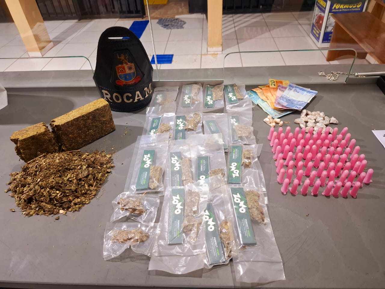 De acordo com informações, os policiais cabo Oliveira, o cabo Soares e o soldado Amaral, estavam realizando operação policial, quando avistaram um adolescente correndo. Ele foi abordado e na sacola, a qual estava em seu poder, foram encontrados 700 gramas de maconha , 78 pinos de cocaína, 22 maconha colômbia, 15 quites de maconha com papel seda , 06 pedras de crack e R$ 201,00 . O menor, que segundo a PM, já tem antecedentes criminais por tentativa de homicídio, foi encaminhado para a Delegacia da Polícia Civil, onde ficou à disposição da família.