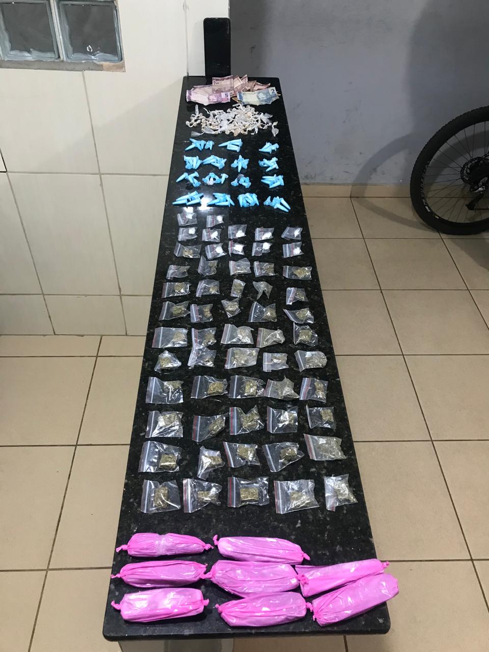 De acordo com boletim de ocorrência, o sargento Caon, os cabos Osmar, Sobral e o soldado Stivanello, estavam em patrulhamento de rotina, quando depararam-se com H.H.G.S, de 19 anos.  Este foi abordado e em seu poder, foram localizadas 124 pedras de crack, 74 pinos de cocaína, 54 porções de maconha, 11 porções de haxixe e R$ 102,00.