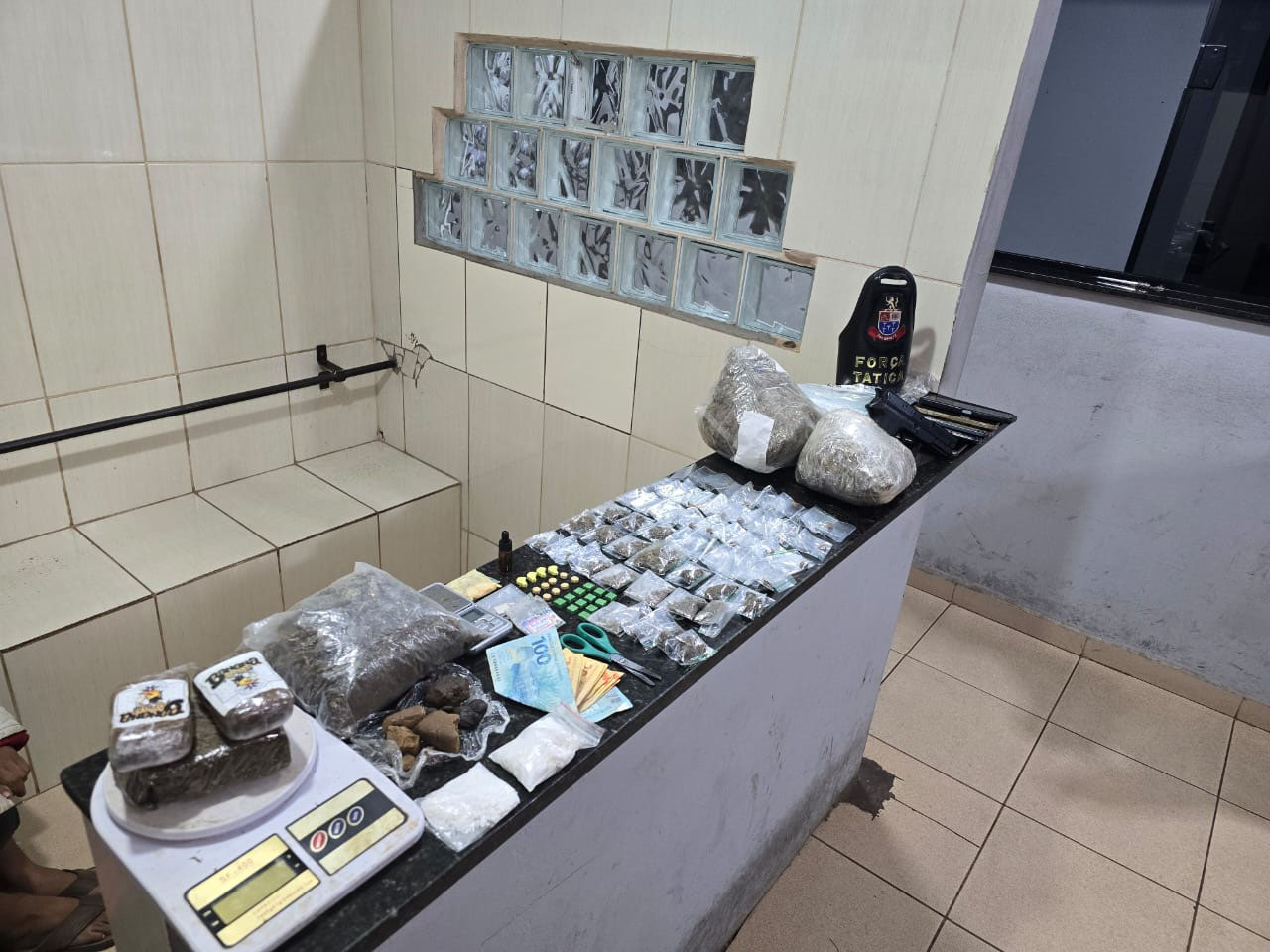 De acordo com informações, os policiais da Força Tática estavam em patrulhamento, quando foram averiguar uma denúncia de tráfico de drogas. Quando se aproximaram da casa, um sujeito saiu correndo e arremessou uma sacola contendo 29 (vinte e nove) invólucros de haxixe que bateu na parede lateral e caiu ao chão. Neste momento os policiais abordaram o suspeito, o qual é menor de idade. Este antes de ser abordado gritou, "moio, moio". Na casa foram detidas mais 2 pessoas, sendo uma jovem de 21 anos, um de 20. No total foram apreendidas 1,759kg de maconha, de haxixe, de cocaÃna, 02 cartelas de LSD, 24 comprimidos de ecstasy , 01 simulacro de arma de fogo, 04 celulares e R$240,00.