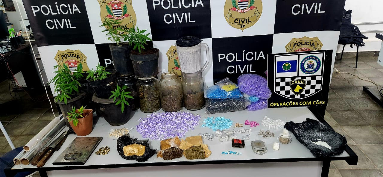 Nesta data (03/09/24), a Polícia Civil de São Paulo, através de equipes da D.I.S.E e contando com apoio de Policiais Civis do 1º/4º Distritos Policiais, durante cumprimento de mandado de busca e apreensão na cidade de Ibaté, precisamente no bairro Jd. América, localizou um liquidificador contendo resquícios de cocaína, 2 facas contendo resquícios de maconha, 17 munições calibre .22, ½ tijolo de “maconha”, 24 porções desta mesma droga, 2 potes de vidro contendo maconha “a granel”, 30 “porções” de “crack”, 401 “ependorfs” contendo cocaína, 15 comprimidos de “ecstasy”, balança de precisão e milhares de “ependorfs” vazios. Ao final, com o apoio do canil da Guarda Municipal de São Carlos, em uma área de mata situada nos fundos do imóvel alvo, foram localizados, ainda, uma plantação contendo 17 pés de maconha, 2 potes de vidro contendo “maconha a granel”, ½ tijolo de “crack” e mais ½ tijolo de maconha. As investigações prosseguem.