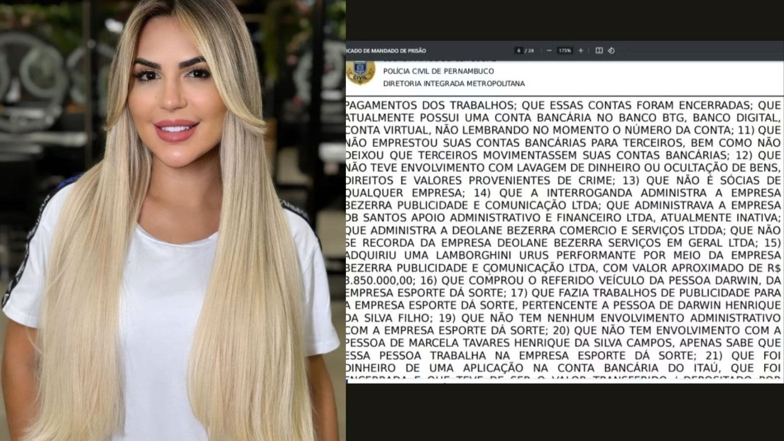 Em depoimento à polÃcia de Recife, obtido pelo Núcleo de Jornalismo Investigativo da RECORD, nesta quarta-feira (4), Deolane Bezerra afirmou que suas únicas fontes de renda são oriundas de trabalhos de publicidade e do meio empresarial e que ela trabalha como advogada, empresária e influenciadora. Ela também confirmou que sua renda mensal é de R$ 1,5 milhão lÃquidos. A advogada e influenciadora disse que não emprestou as contas bancárias para terceiros e não teve envolvimento com lavagem de dinheiro ou ocultação de bens, direitos e valores provenientes de crimes. Bezerra ainda alegou que administra a empresa Bezerra, Publicidade e Comunicação, e que adquiriu uma Lamborghini por meio da empresa no valor aproximado de R$ 3,8 milhões. Ela comprou o veÃculo de um representante da empresa Esportes da Sorte. Apesar de fazer publicidade para empresa essa empresa, ela disse que não tem qualquer vÃnculo empresarial com a empresa. Deolane foi detida na manhã desta quarta (4), em Boa Viagem (PE). Uma investigação contra a advogada identificou um desvio total estimado em R$ 2 bilhões. A operação, feita pela PolÃcia Civil, contra lavagem de dinheiro e jogos ilegais conta com a participação de 170 policiais, e abrange várias regiões do paÃs. Uma das mansões dela em Barueri (SP) é alvo de busca e apreensão, além de joias e carros de luxo.
