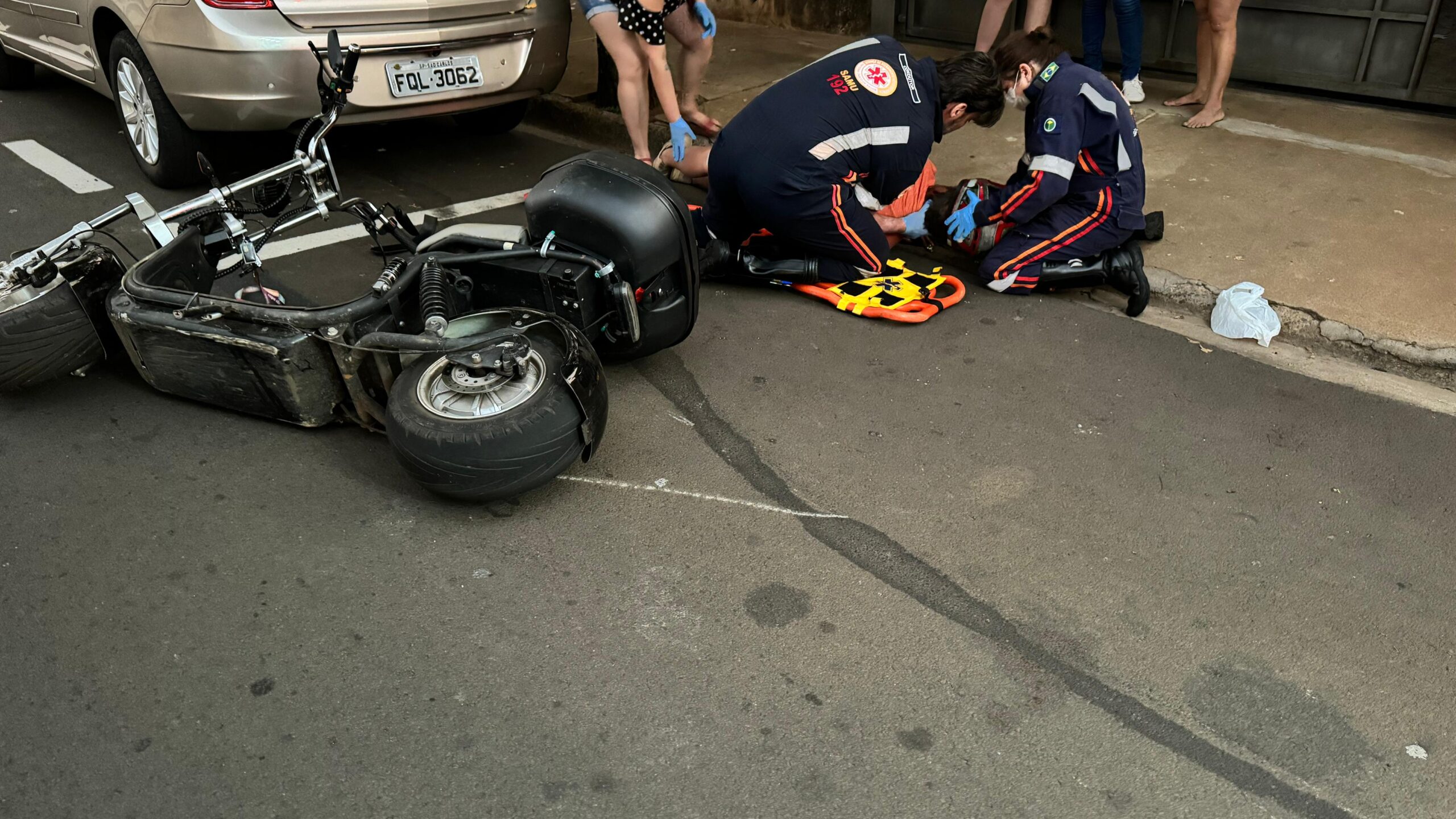 Um homem de 43 anos foi socorrido pelo SAMU nesta tarde de quarta-feira,  04/09/2024, após se envolver em um acidente de trânsito na Rua Oswaldo Denare, bairro Maria Stela Fagá,  São Carlos-SP. De acordo com informações,  ele conduzia a moto elétrica,  teria colido em veículos defronte a um mercado,  continuou transitando até colidir na traseira de outro carro, o qual estava estacionado. O SAMU foi acionado e socorreu o ferido. Aparentemente sem gravidade. Foto: São Carlos no Toque
