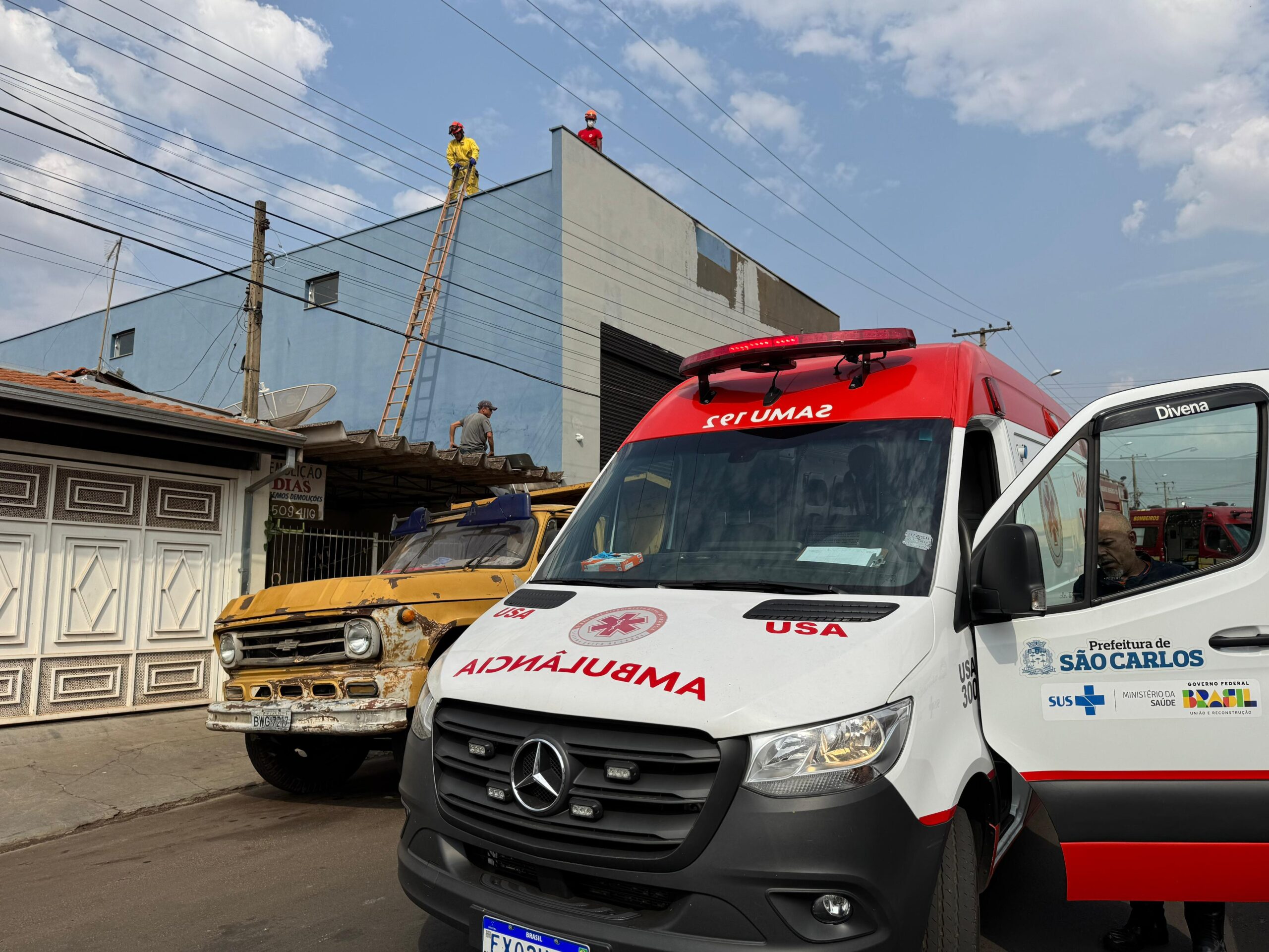 Um trabalhador de 51 anos  ficou ferido ao sofrer  um choque eletrico nesta tarde e sexta-feira, 20 de setembro de 2024, na Rua São Gabriel, São Carlos – SP. De acordo com informações, o homem estava no telhado de um imóvel, quando acabou sofrendo a descarga elétrica. O SAMU e o Corpo de Bombeiros foram acionados e a vítima foi resgatada com vida e encaminhada para a Santa Casa. Fotos:  Vinícius/São Carlos no toque