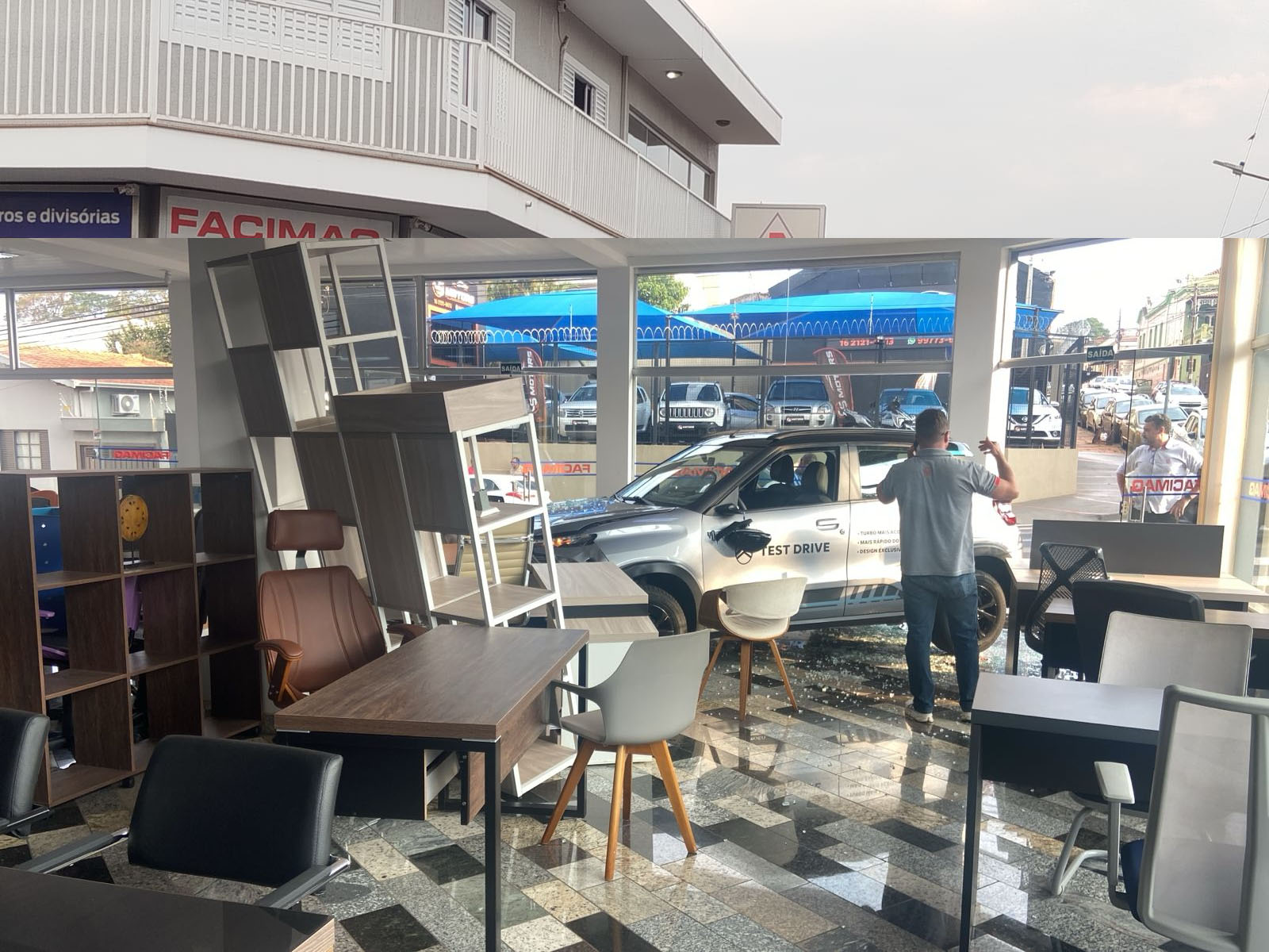 Um carro foi parar dentro de uma loja nesta tarde de quinta-feira, 17 de outubro de 2024, após uma colisão na Rua Aquidaban, cruzamento com a Rua Geminiano Costa, Centro de São Carlos-SP.
