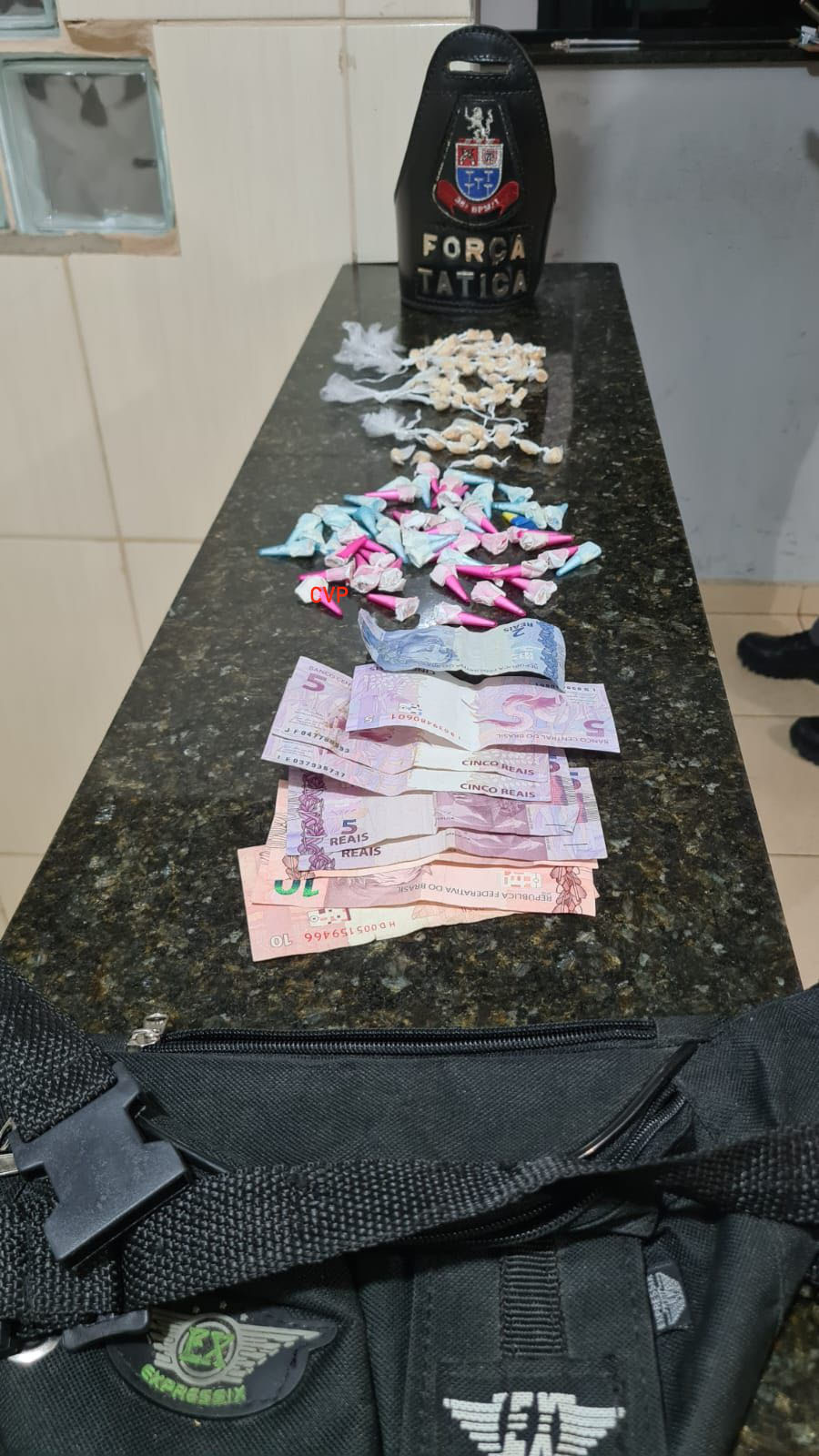 De acordo com boletim de ocorrência,   D.C.S, de 18 anos, foi abordado por uma equipe de Força Tática. Com ele foi localizada uma pochete e no interior desta, 53 pinos de cocaÃna, 95 pedras de crack e R$ 57,00. O sujeito foi encaminhado para a Central de PolÃcia Judiciária, onde foi autuado em flagrante e recolhido ao Centro de Triagem de São Carlos.